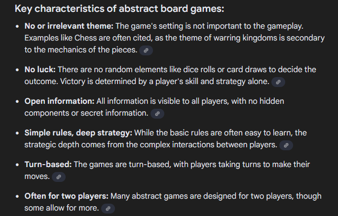 >>96908309because in a vacuum when discussing board games they're unable to talk about the mechanics themselves so they talk about superficial things like the theme and art even though while playing they're not relevant at all if not for the first 5 minutes of a gamesee also the ones screeching about molly house's "theme" apparently involving taking dicks in the ass even though when you sit down at the table what you see is something that looks like a Monopoly board>>96908374no, see pic related, the relevancy or not of the "theme" isn't the SOLE characteristic of "abstract" games, "abstract" isn't just an adjective, it's a genre
