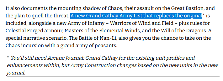 >>96935775And you still need to buy the old one to get the statblocks> You’ll still need Arcane Journal: Grand Cathay for the existing unit profiles and enhancements within, but Army Construction changes based on the new units in the new journal.