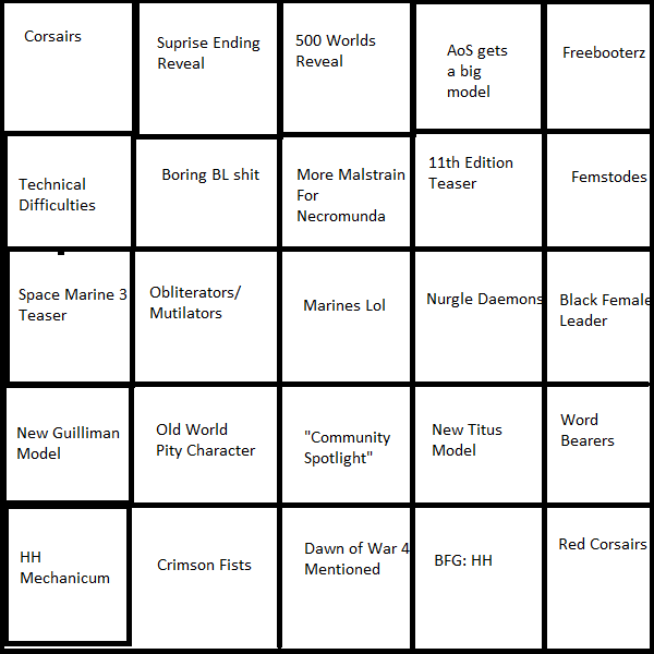 >AoSFiredrake dwarves>NecromundaDwarves>LigmaDark mech>HHCustodes>The Old WorldChaos>40kFuck if I know>Possible big revealsBattlefleet Gothic, for even less excuses of "plastic sprues are expensive, please understand"TL;DR: Win-winPlastic Titan (32mm or 6mm? Who knows...)Oh and the fucking AoS boardgame