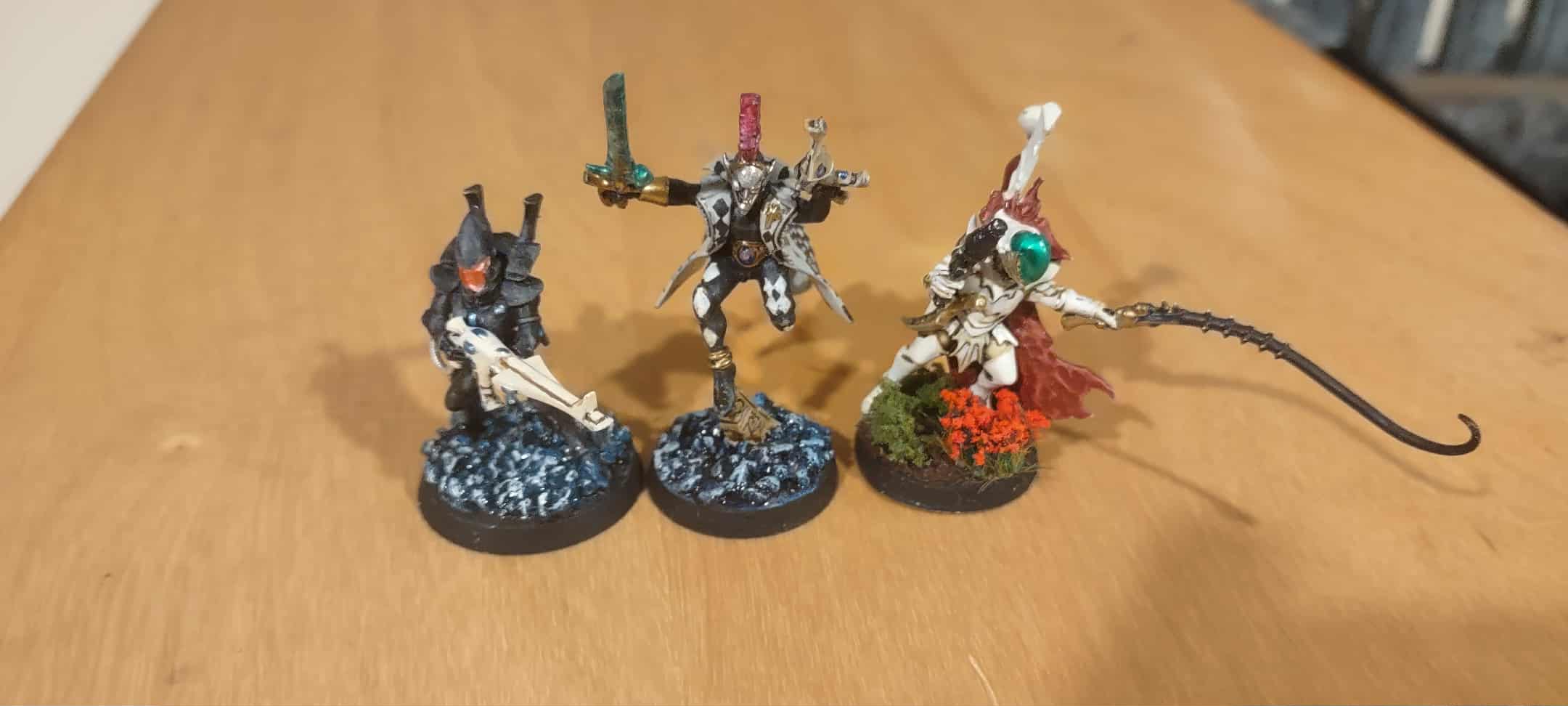 >>96945132Picture of the finished Troupe. Harlies are meant to act as a "bridge" between my Craftworlds and Dark Eldar.I can't really say that I can do BETTER at painting the models. I'm aware of my own (lack) of ability. I just want to make sure that the models look alright from the tabletop.