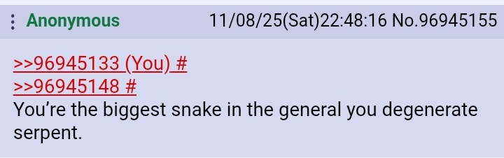 >>96945133>>96945148You’re the biggest snake in the general you degenerate serpent.