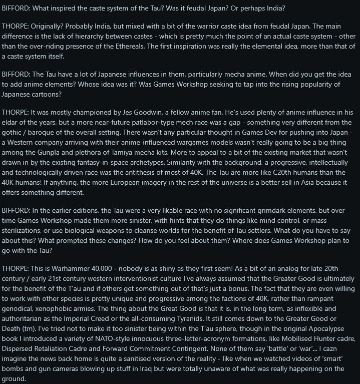 >>96947705NTA>Again, we have been explicitly and repeatedly told it was and is justified.No. We didn't. You are a straight-up liar here.Dan Abnett recently came out and said that the Imperial Xenophobia was programmed into the Imperium by the Emperor to remove Xenos as external sources of information that threaten his new order. How much of an idiot do you have to be to not question that the T'au, Votann, and many human civilizations didn't develop a tenth of the Imperial xeno hatred? How the dogmatic hatred of the alien is uniquely Imperial.>They've existed for fuck all time, barely expanded and don't have to deal with psykers. They existed for thousands of years. Rule over hundreds of worlds. Their Empire contains species that are entirely made up of psykers such as the Niccasar and Nagi. And thanks to the hundreds of billions of humans living in their empire, they have no small amount of human psykers and many of them are in positions of power/trust.