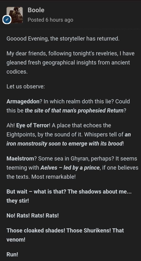 >>96947562>the imperium has been forced to take hard linenope, it chose to, other human empires, as well as the tau empire were faced with the same choice, choose coexistence and proved that it was possible, until the imperium came along and made the neighborhood bad and all the alleys dark.Now the imperium is not allowed to be flexible because it would crumble on itself if it did, but when the imperium codified the no-aliens policy that wasn't the case, they chose to be hyper aggressive because they wanted to be the top dogs, not because it was the only way to survive.
