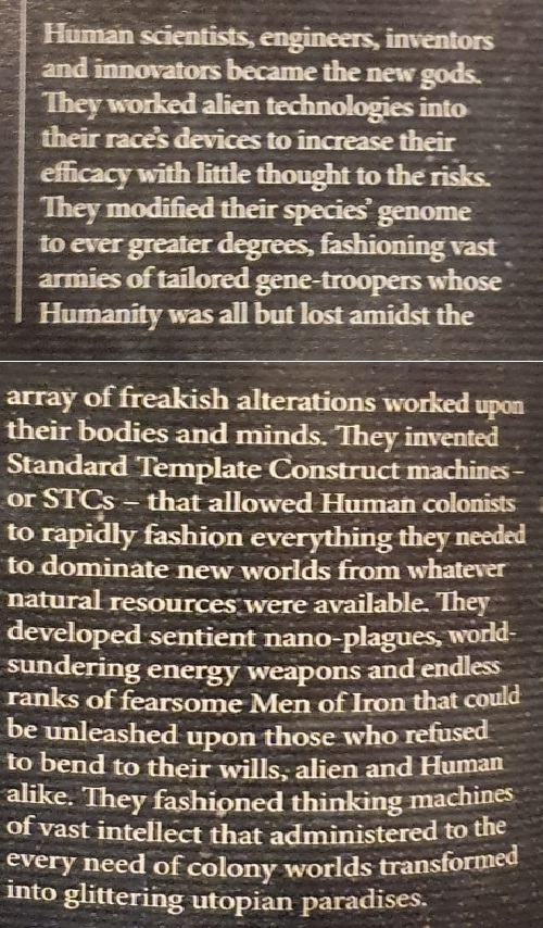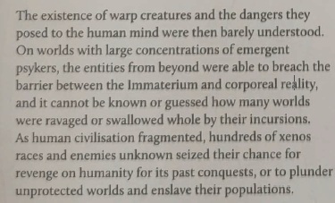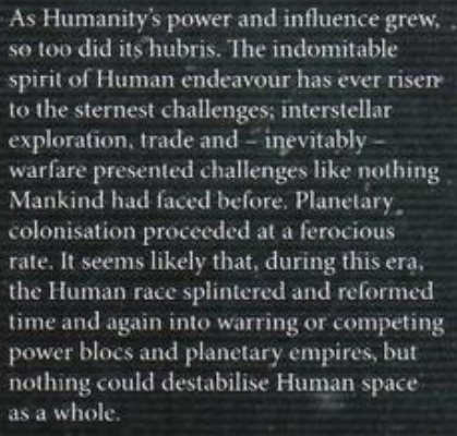 >>96948426>"These ancestral foes, besieging human civilization since it first took to the stars, pose the direst of threats to the future of Mankind"Idiot. That's from a part about the Imperial knowledge of the DAoT unknown past. It's not stating solid fact. Meanwhile lets see what humanity is up too from the main books