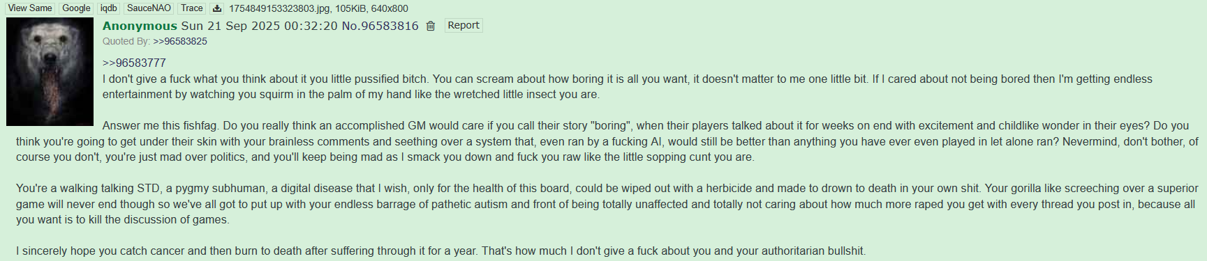 >>96948040You genuinely need medication and mental health treatment. What the fuck is your problem