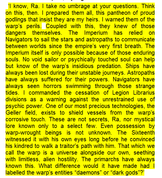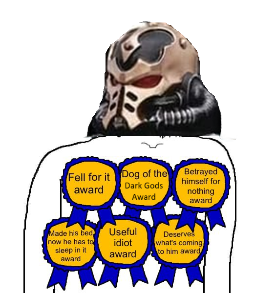 >>96948262 #There’s no implication that Slaanesh was stopping humanity from re-acquiring their previous heights, the emperor literally never even gave humanity the chance, as immediately after the warp calmed enough for FTL to be possible again the Emperor set about conquering everything humanity had built, and any human civilizations that resisted were destroyed and their people wiped out.Oh, and btw some of these human civilizations had survived coexisting with xenos for over 5,000 years. The Imperium wiped them out anyways not because they were a threat, but because it threatened their narrative. The emperor knew that most xenos were friendly, so to sell the lie he needed to tell to create his desired dystopia he had to kill off as many of the good ones as he could