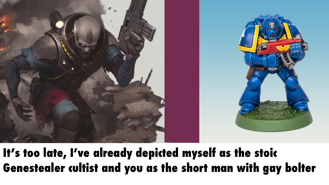 >>96978590>But LatD is just humans slaves to the will of alien star gods, and GSC already do that better. They even have brood brothers for a military themed version with tanks.Because the hive mind isn't a chaos god and we need a traitor guard/cults/maybe throw in some alien cultists like slaanesh worshiping sslyth to bring it all together.