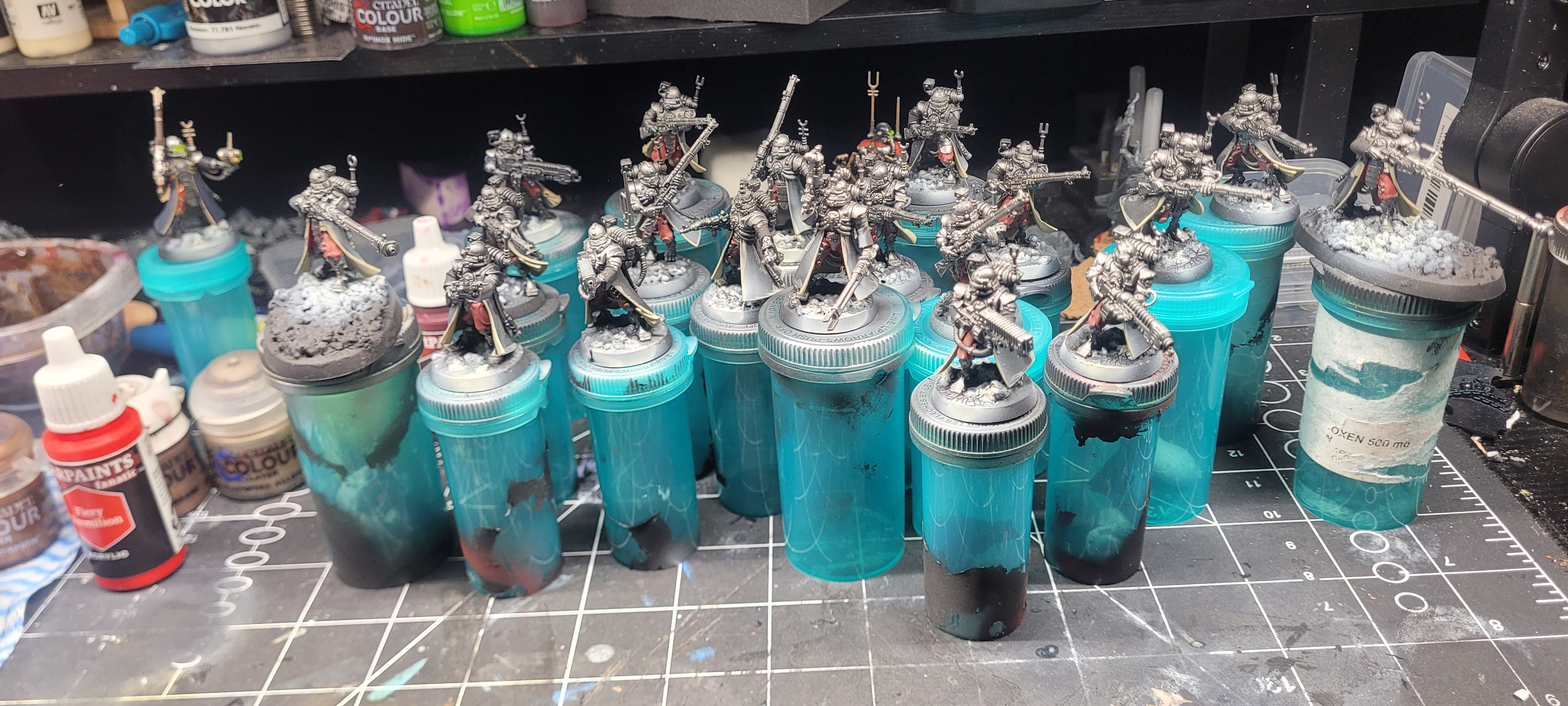 >>96982672Batch painting 20 vanguard. I base coated their coats today, so the next step is detailing their guns and cleaning up where I was sloppy.