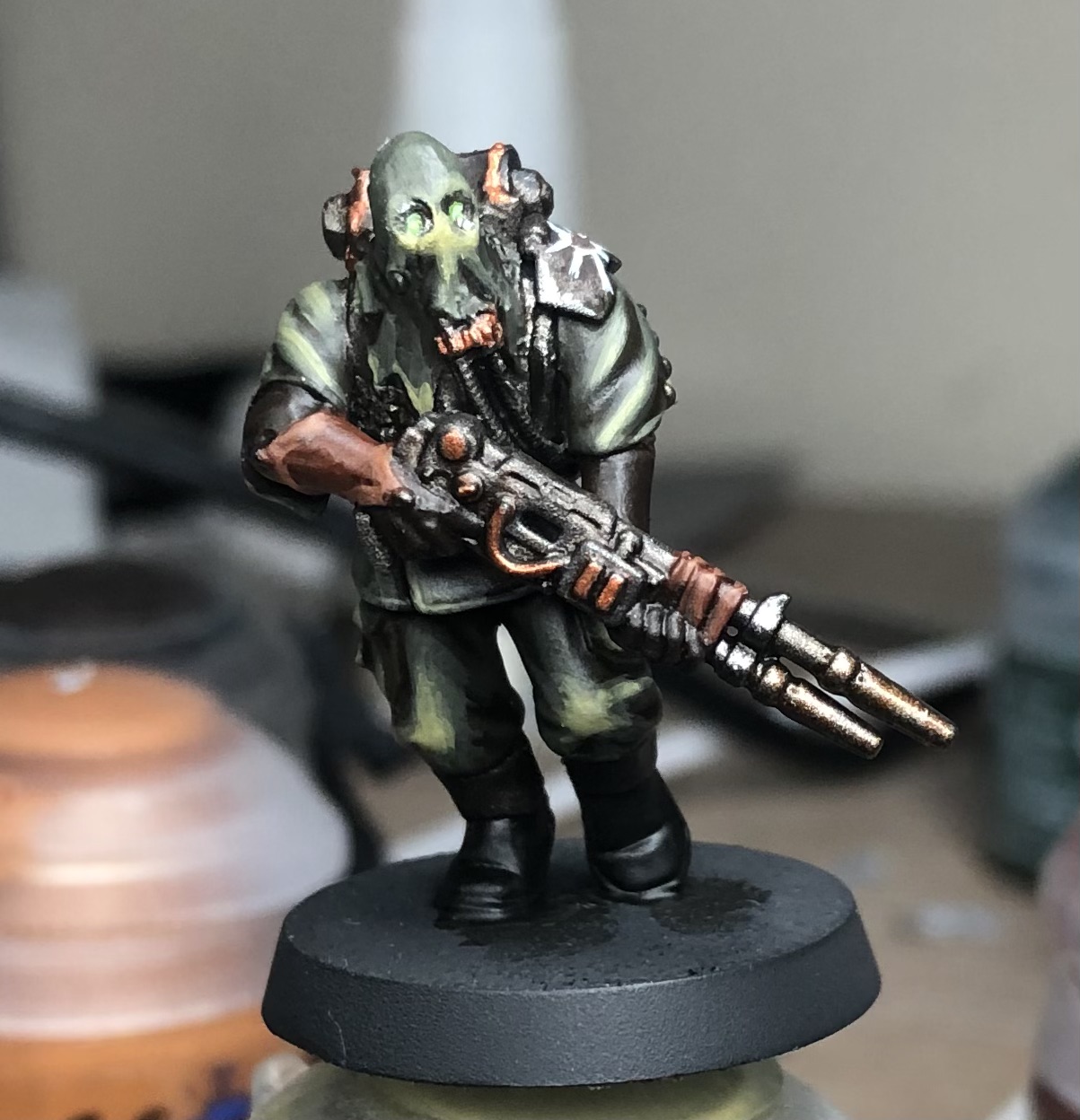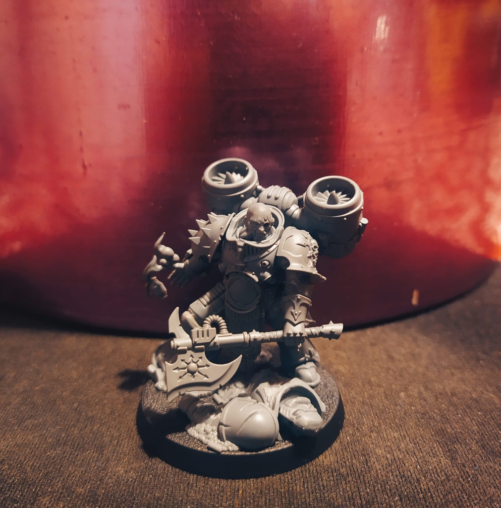 Here's the newest member of my warband. A former death guard assault sergeant now loyal to the black legion. His MO is to infiltrate enemy positions and drop virulent smoke to break defensive lines. Sorry for the shitty lighting, it gets dark so early in winter.