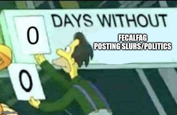 >>96985814>I never say political thingsI was gonna say reset the counter but I don't think it's ever moved from zero days