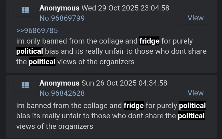 >>96986031For the record. I AM a leftist too. A filthy fucking commie even. I just don’t bring my off topic shit into things here and keep it where it’s appropriate. Lamenteranon and O&T are right about decalanon, not because he’s bad at painting, not because he’s a troll. But because he can’t just let shit be. This is the one and only time I will talk about this, I’m just tired of it after the last year and a bit and I know it’s probably all just bait but just fucking stop please. I can’t even browse the thread while taking a shit without some new blowout.>>96985967Thank god. Sorry to have added to it.