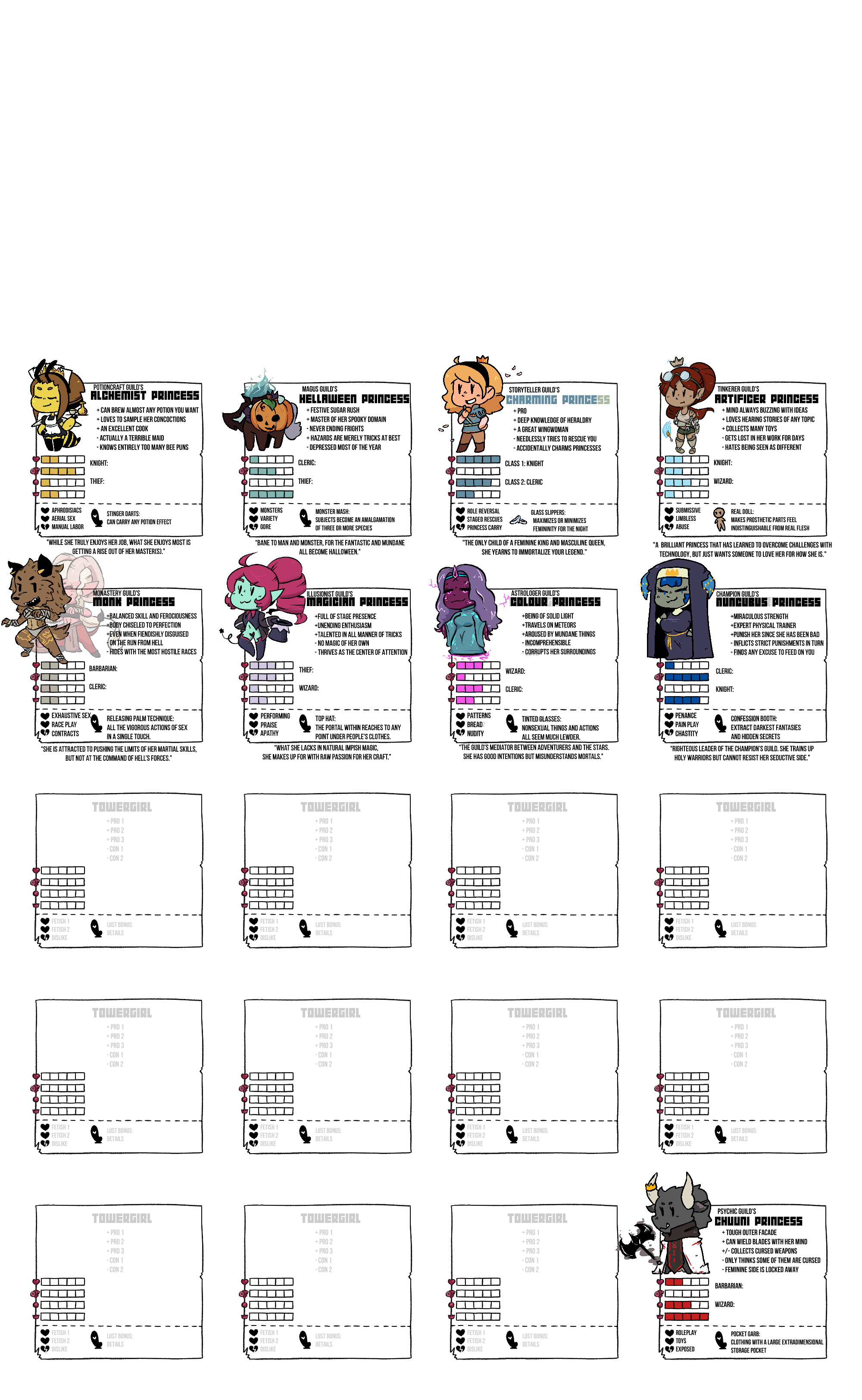 Jabbering Jabberwock EditionDiscussion of the Towergirls CYOA, RPG, Setting, or Video Games welcome here!Everyone is welcome.FAQhttps://pastebin.com/vv4xQuwDCharts:Main Gens: https://e-hentai.org/g/2556775/f1669e072b/Imgchest backups(not sorted): https://imgchest.com/p/na7ko9dky8dhttps://imgchest.com/p/pg73rmbv7rnLegacy Charts: https://imgur.com/a/IRtoHXhSide Quests: https://imgur.com/a/7euVXRTExiled Lands: https://imgur.com/a/p7AbcXJAlternate Costumes: https://imgur.com/a/xyF47FPNyx's Fusions: https://imgur.com/a/d6eLwXkFan V4 Gen:https://imgur.com/a/ddgAGTUGats's V4+Chibi Gen:https://imgur.com/a/xSMExqhV4 World Map:https://imgur.com/a/KMVGo3fDiety Writeups:https://pastebin.com/MUpQvNEqCommissions:https://imgur.com/a/8mAmCgRResources:Booru (Fan Art Collection) - http://tower-girls.booru.org/Backup Booru -https://towergirls.booru.org/index.phpBrushes, Fonts, and Templates - http://www.mediafire.com/file/k83sgc5t5dfvv3s/Towergirls_Files.zipGats Wiki - https://the-official-towergirls.fandom.com/wiki/The_Official_Towergirls_WikiFolder Containing Artwork - https://drive.google.com/open?id=1GCjgb8zXq2Myg8G39EockjdTTYShOQjwGames & Tabletop Rulebooks:https://mega.nz/folder/gZlSHAgT#w3aVD2Qyr1C0zdV4psc9EAQuests:https://wizdingo.proboards.com/ (Eversor)Where do I upload to share?https://catbox.moe/If you'd like access to the discord or have anything you wish to talk about privately involving towergirls, editing, etc, please contact Brumus here:A) Broken-Tower@hotmail.comB) "Tired Knight" on SteamDon't forget to check the other Tower girl threads on other boards;Previous Thread: >>96744228