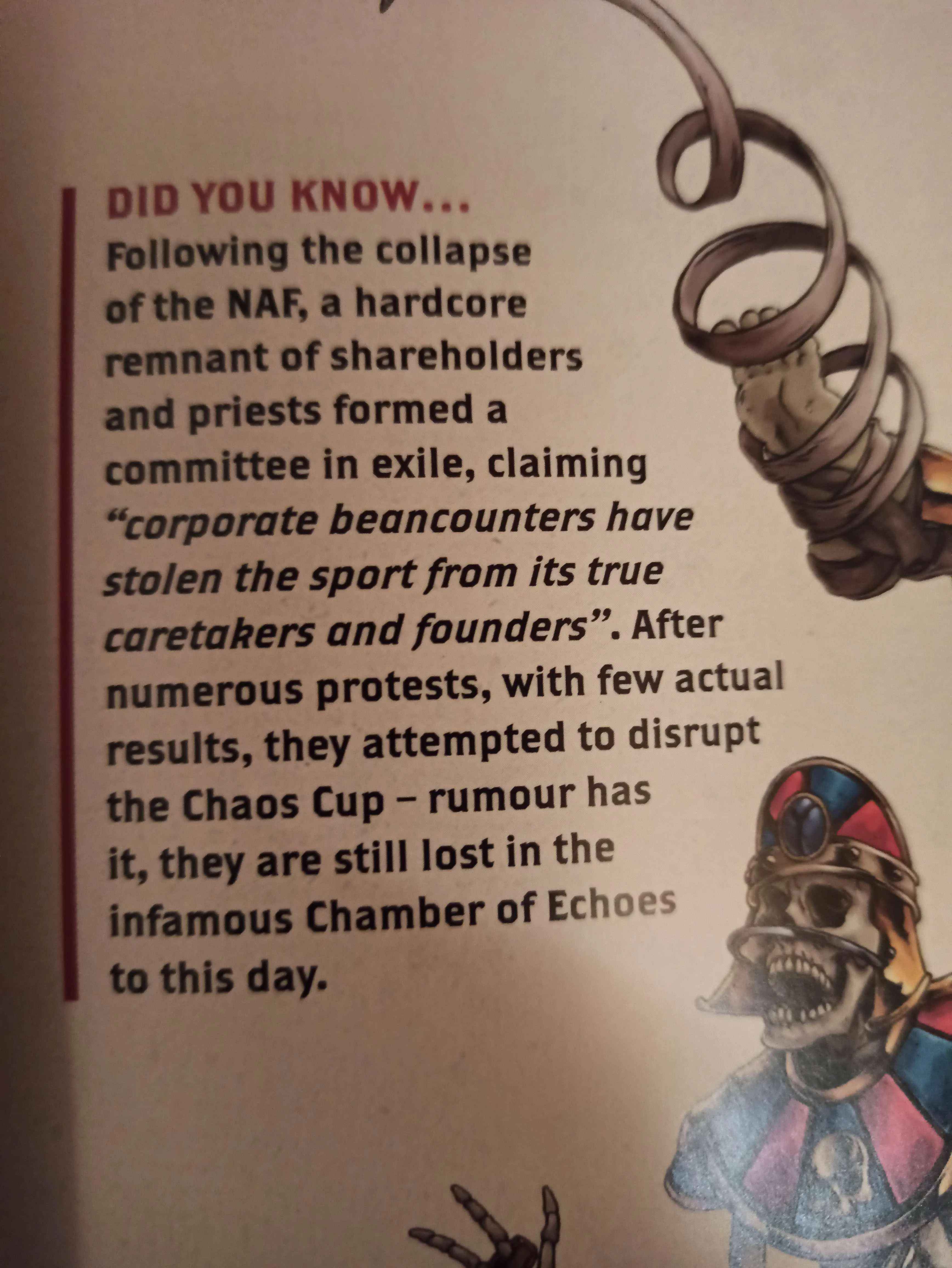 >>97037164This was back when Specialist existed the first time and I think it was for LRB5 or thereabouts. BB was still more or less supported via Specialist and thriving but that was back before Chapterhouse and you could have rules for things without a model existing for it. So the game had a ton of Star Player profiles that didn't have models because Specialist could only get so much stuff made since they were more or less a side hustle as far as GW was concerned. 3rd party physical models were around back then and basically had no real issues so long as the manufacturer played the nudge nudge wink wink naming convention when selling them. But invariably people bought said 3rd party models and used then in tournaments that had GW prize support. Keep in mind not GW organised tournaments, just ones that had GW put up a couple boxes for prizes. But they saw people using 3rd party models and cracked the shits and said they would have to pull prize support from any tournament that allows 3rd party models being used, and that they wouldn't release the next version of the rulebook unless this whole practice stopped. All because people dare use non-GW models for SPs that had no official GW model. Eventually the rulebook was released though and in true GW style instead of just making the models they decided it better to yeet every SP from the rules they didn't make a model for since that fixed the problem as far as they were concerned. That is most definitely part of what contributed to the formation of the NAF and the move away from GW being the arbiter of BB.