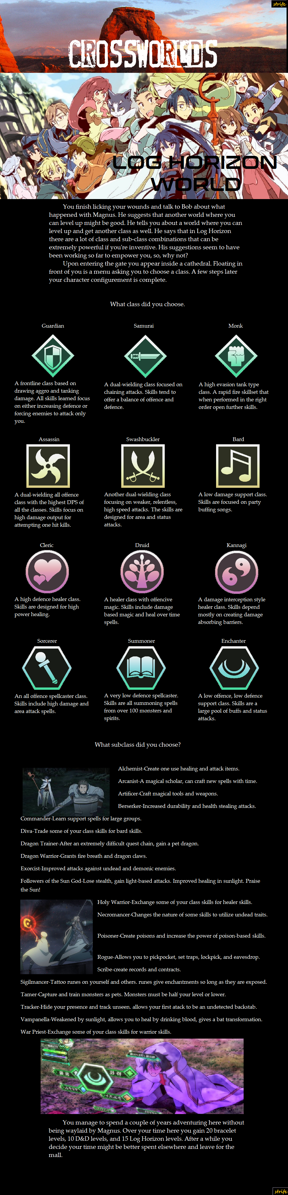 >>97038652>Dark GuildsI could add a section like that to the Guild Membership Section, an alternative guild with far less morals and scruples who are funded by Nobles less enthused with the prospect of The Explorer's Guild.>Non-Human RacesI was initially going to make a Race section, of which whatever race you chose influenced your Element, but instead I just left the pronouns vague enough so that you can choose a generic fantasy race without pissing anybody off.