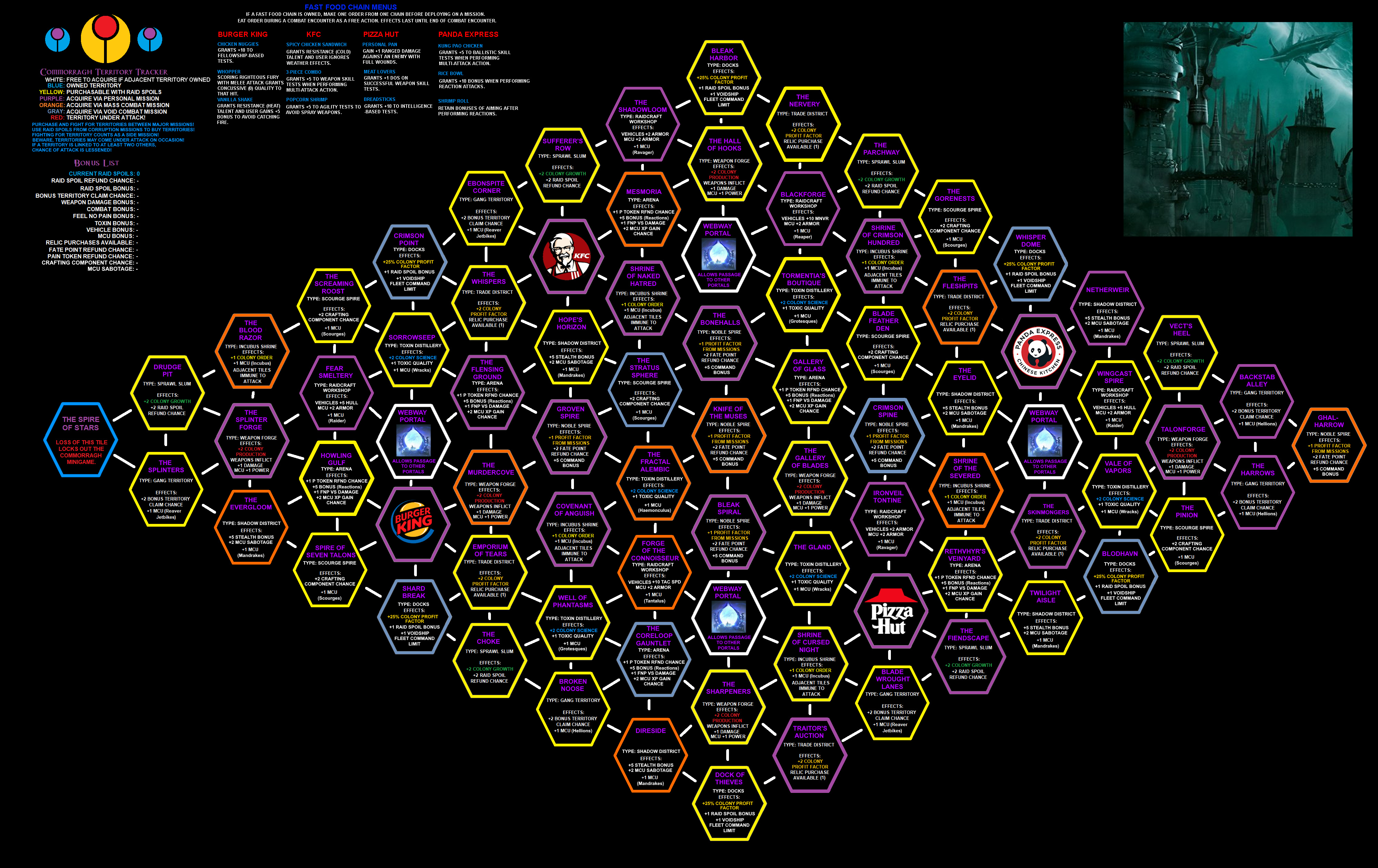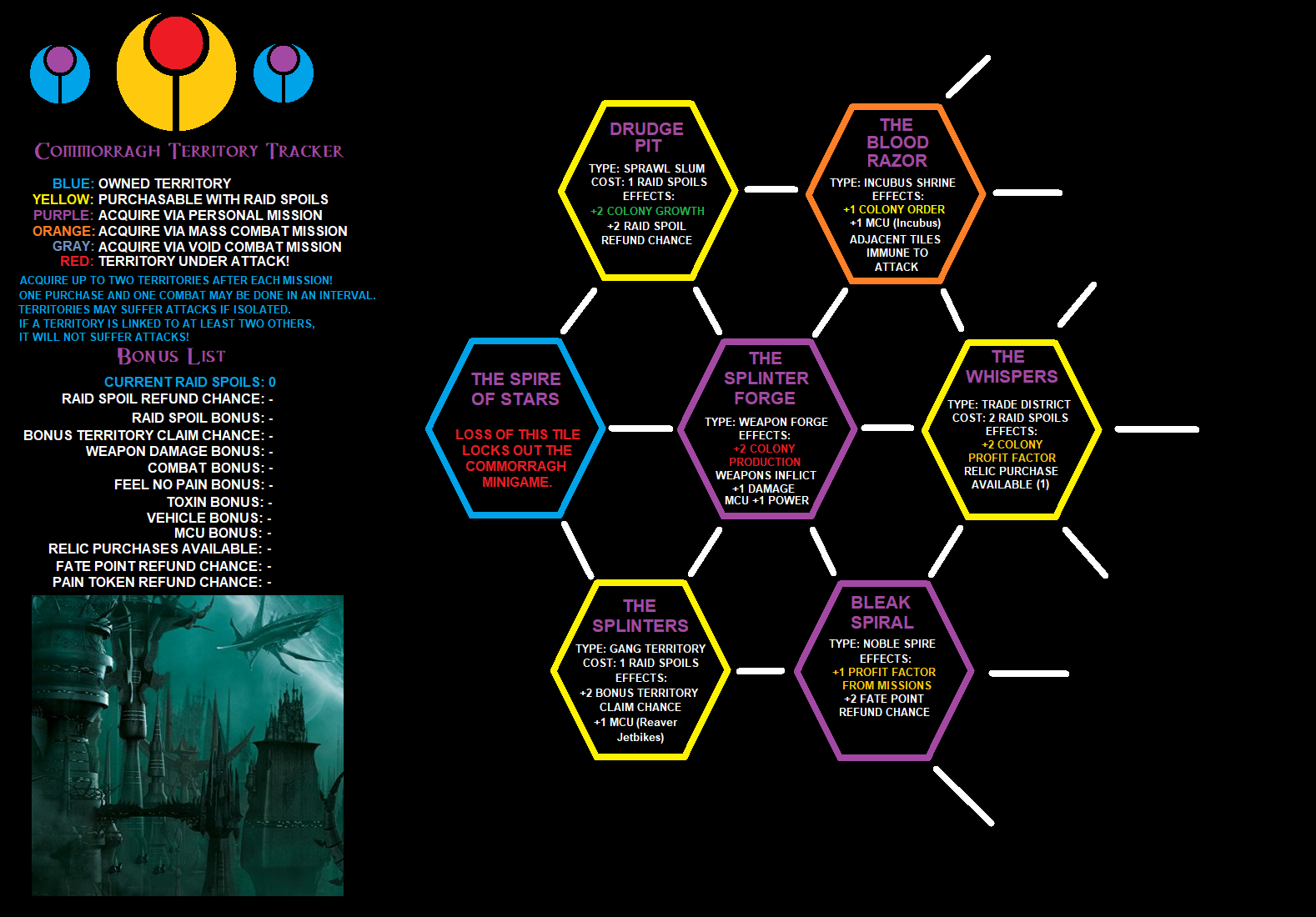 The Scramble for Commorragh minigame will be one of the three minigames available in my next series. By doing Corruption Missions (side missions), peeps will gain Raid Spoils. Those raid spoils can be used to buy territory, while players can fight for others. Territories have a effects on player characters and their colony, thus allowing them to do Corruption Missions more effectively. How far will ambition take you before it all crashes down?