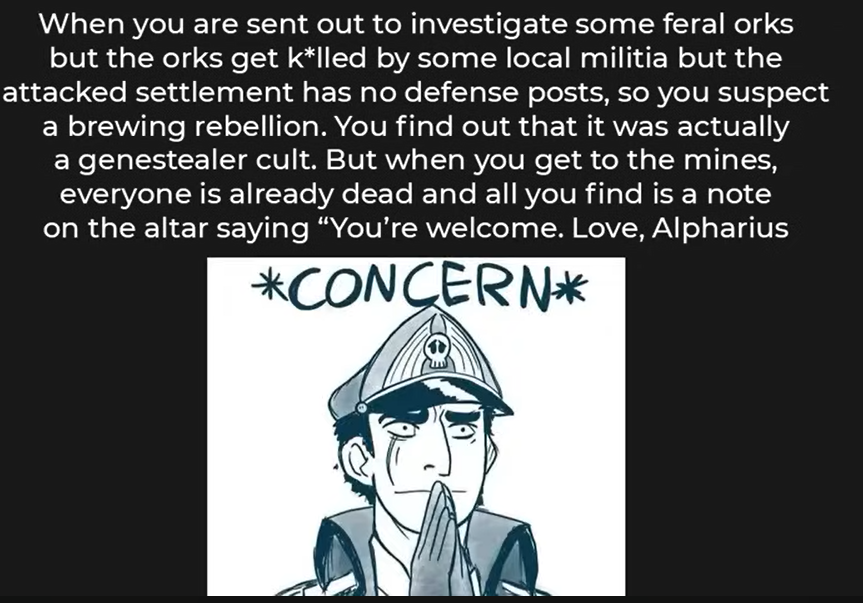 So we killed everybody and scared one who surrendered into being mindbroken. The psyker sits by a pile of medium rare evidence and does his divination.