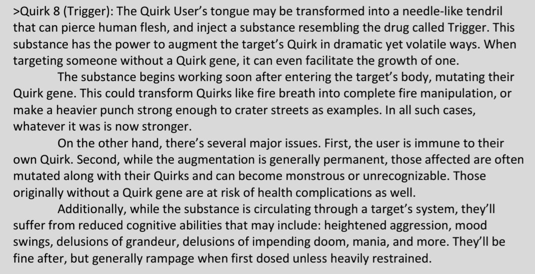 >>97098759 >Quirk 8 (Trigger): The Quirk User’s tongue may be transformed into a needle-like tendrilthat can pierce human flesh, and inject a substance resembling the drug called Trigger. This substance has the power to augment the target’s Quirk in dramatic yet volatile ways. When targeting someone without a Quirk gene, it can even facilitate the growth of one. The substance begins working soon after entering the target’s body, mutating theirQuirk gene. This could transform Quirks like fire breath into complete fire manipulation, ormake a heavier punch strong enough to crater streets as examples. In all such cases, whatever it was is now stronger. On the other hand, there’s several major issues. First, the user is immune to their own Quirk. Second, while the augmentation is generally permanent, those affected are oftenmutated along with their Quirks and can become monstrous or unrecognizable. Thoseoriginally without a Quirk gene are at risk of health complications as well. Additionally, while the substance is circulating through a target’s system, they’ll suffer from reduced cognitive abilities that may include: heightened aggression, mood swings, delusions of grandeur, delusions of impending doom, mania, and more. They’ll be fine after, but generally rampage when first dosed unless heavily restrained.There you go.