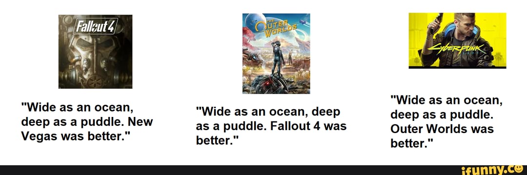 Nobody ever said "Fallout 4 was better" or "Outer Worlds was better" unironically ever.