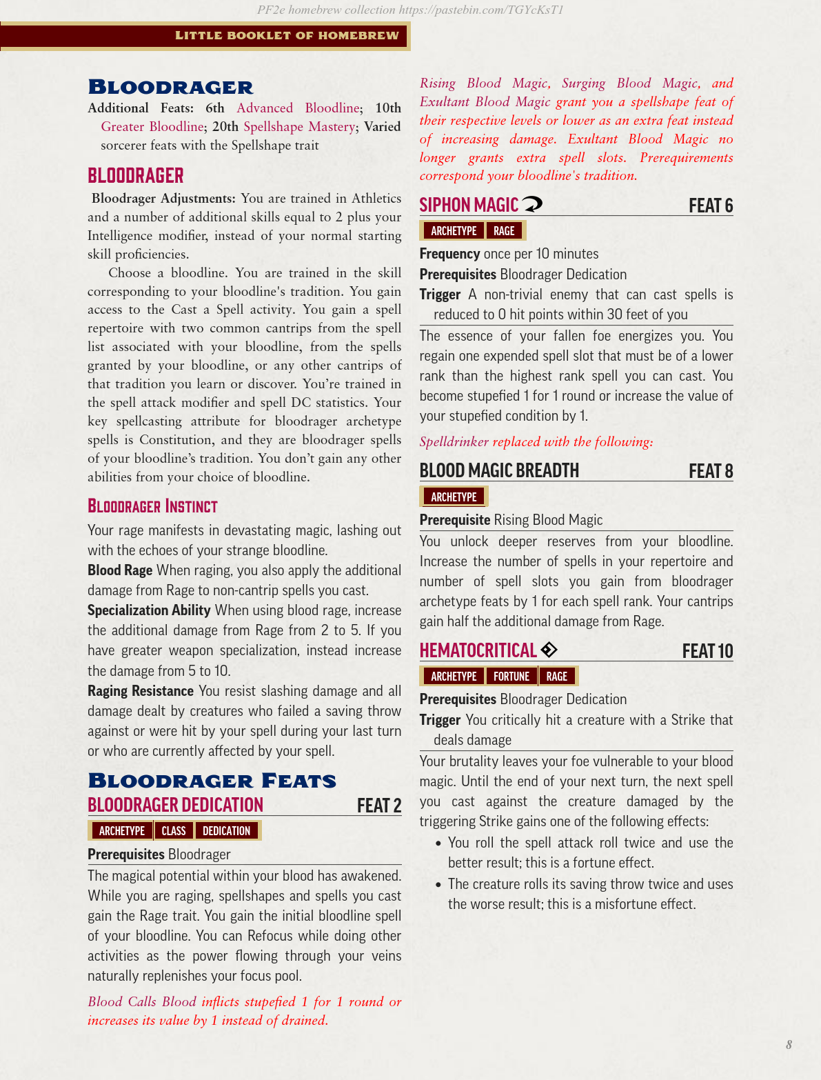>>97109630Yeah, the sorc bloodlines missing was why I added them, but that also meant that the pseudovampire stuff made (even) less sense. I also didn't like the action and health tax song and dance with Harvest Blood and the drained condition.As for incentive to use spells, I changed the resistance part around that. Still not sure if cantrips should also get full rage damage (probably yes, you're still a martial, even with Hematocritical).
