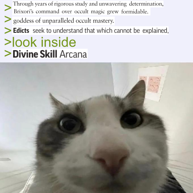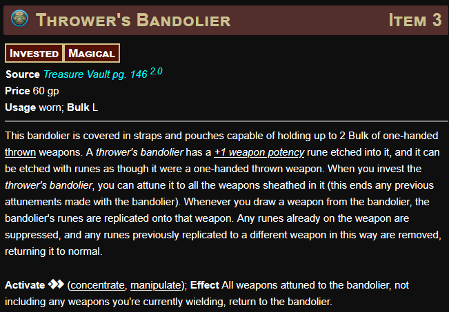 >>97140591ah yes, "their" moderating staff, for the public subreddit that is not owned or managed by Paizo, that moderating staff the last I looked, yes, cool, got it. If you're going to schizopost about shit paizo staffers are saying and doing at least cite actual paizo staff for fuck's sake.>>97140652I'm kind of baffled that Exemplar was the closest to "good" throwing weapon support a class has and... Well, I guess I can exemplar archetype on another class? Because exemplar itself still has kinda shit throwing support outside of Shadow Sheathe until level 10, but that fights directly with its in-class flight, which sucks. But Exemplar in general has kind of shitty feat support for literally anything until level 8-10 anyway so whatever.