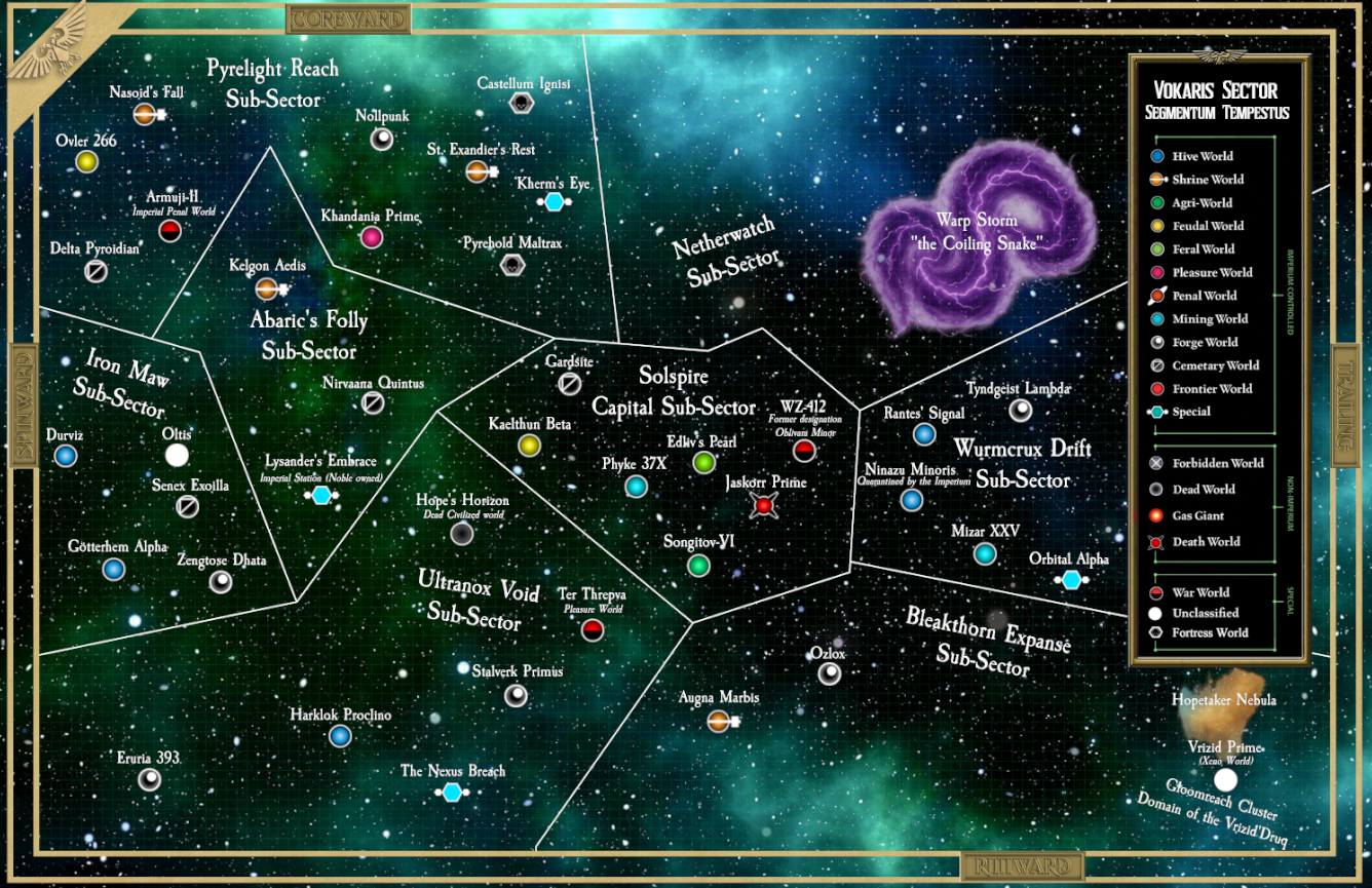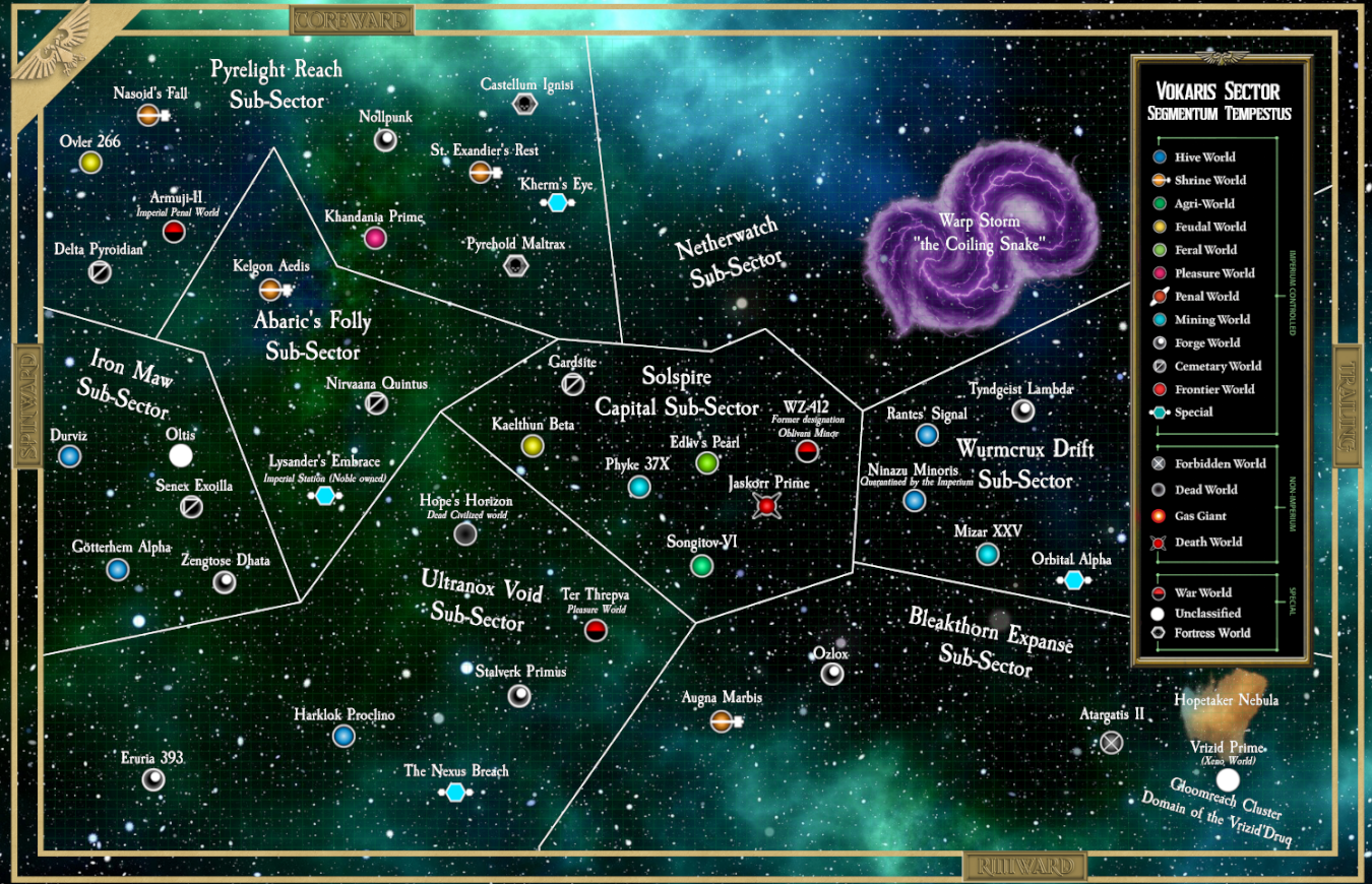 Your efforts in compiling the information on [Vokaris Sector] and its eight subsectors have been further garnering plenty of praise from your peers and lords above your meager station, we implore you to resume your task to gather this stellar data about this sector in our glorious Imperium of Man