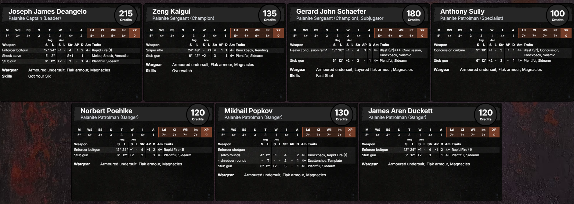 >>97117553The "Gang alignment" rule for Cawdor is written to determine their alignment based on the balance between Cawdor and Redemptionist.Pure redemptionists is still decent but you'll be missing the D3 cawdor guys that always show up and struggling early, on top of being Outlaw. Redemptionists benefit greatly from the "no weapon discard" rule with Exterminator being cheap and not taking up a slot, giving every Redemptionists better mid-late campaign development and much more versatile than other gangs. They also get access to chainaxe with exterminator for ganger, one of the best CC weapon in the game that most other gangs can only get on leader or champs.