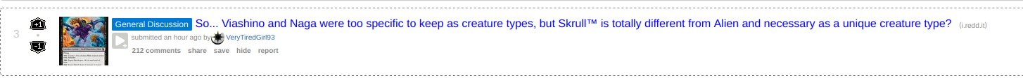 >>97154612Well they plan to still use nagas, in Magic sets. But Naga was a poor type because it lacked synergy with Snakes, the Orochi in Kamigawa which were Naga-like were just Snakes and basically it's just Tarkir that has them. They're Snakes for the same reason Viashino are Lizards, broadly speaking.Conversely, Skrull exists to represent the IP. Same with Gamma. You can't really use an existing type to delineate between Hulk and others. You COULD maybe use just Alien Shapeshifter for all Skrulls, to be sure, but clearly they wanted to be a bit more specific. EOE, for example, didn't use the Alien type at all. One-offs will more likely be Aliens, but we'll see.