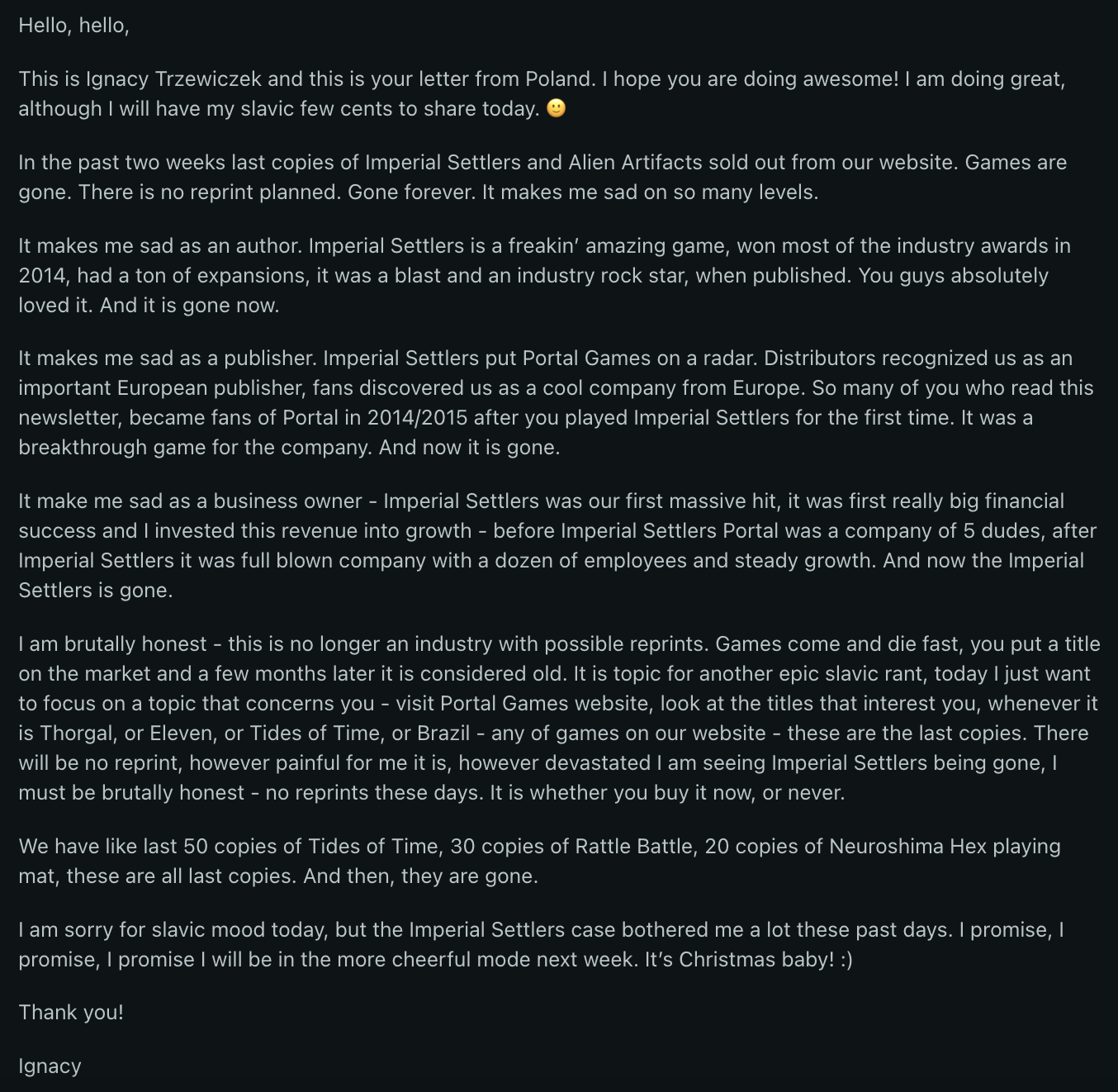 >>97170526Man I fully read that in his voice. Just ignacy being ignacy; it very much IS the time of reprints. Just that the games reprinted are mostly 20 years old and more. If the demand is there, they'll be reprinted. If not, there's no reprints. Simple as.Imperial settlers is such a middle of the road 7/10 game it is all too easily replaced imo. They habe been and will be printing Neuroshima for a long time because it's something more unique, hence it not getting mentioned.For more ignacy being ignacy, look for his post on the stronghold (undead?) gulag entry where he wrote an essay-length post about how much he hates stronghold (his design)