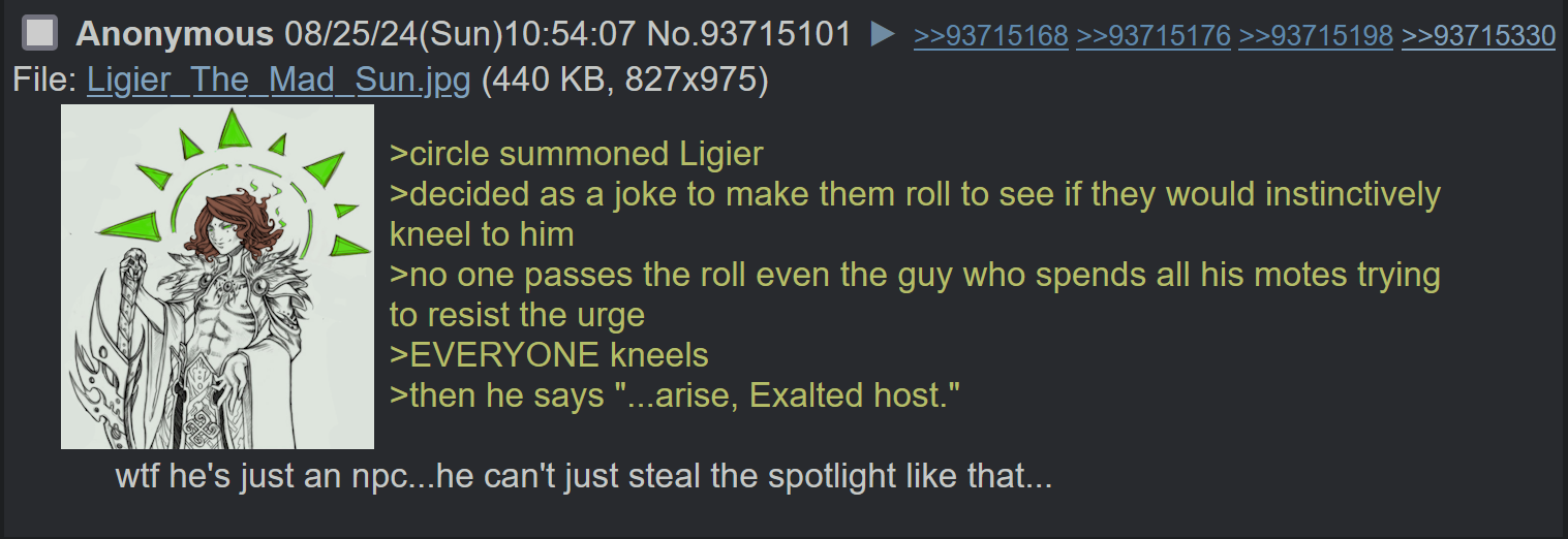 >>97172204>The threads have been worse than everThe period just before drawanon started posting was worse.>>97170613I think it is more of a hail Mary, than favoritism, since after Infernals, exalted will enter a lull like 2e scion did.
