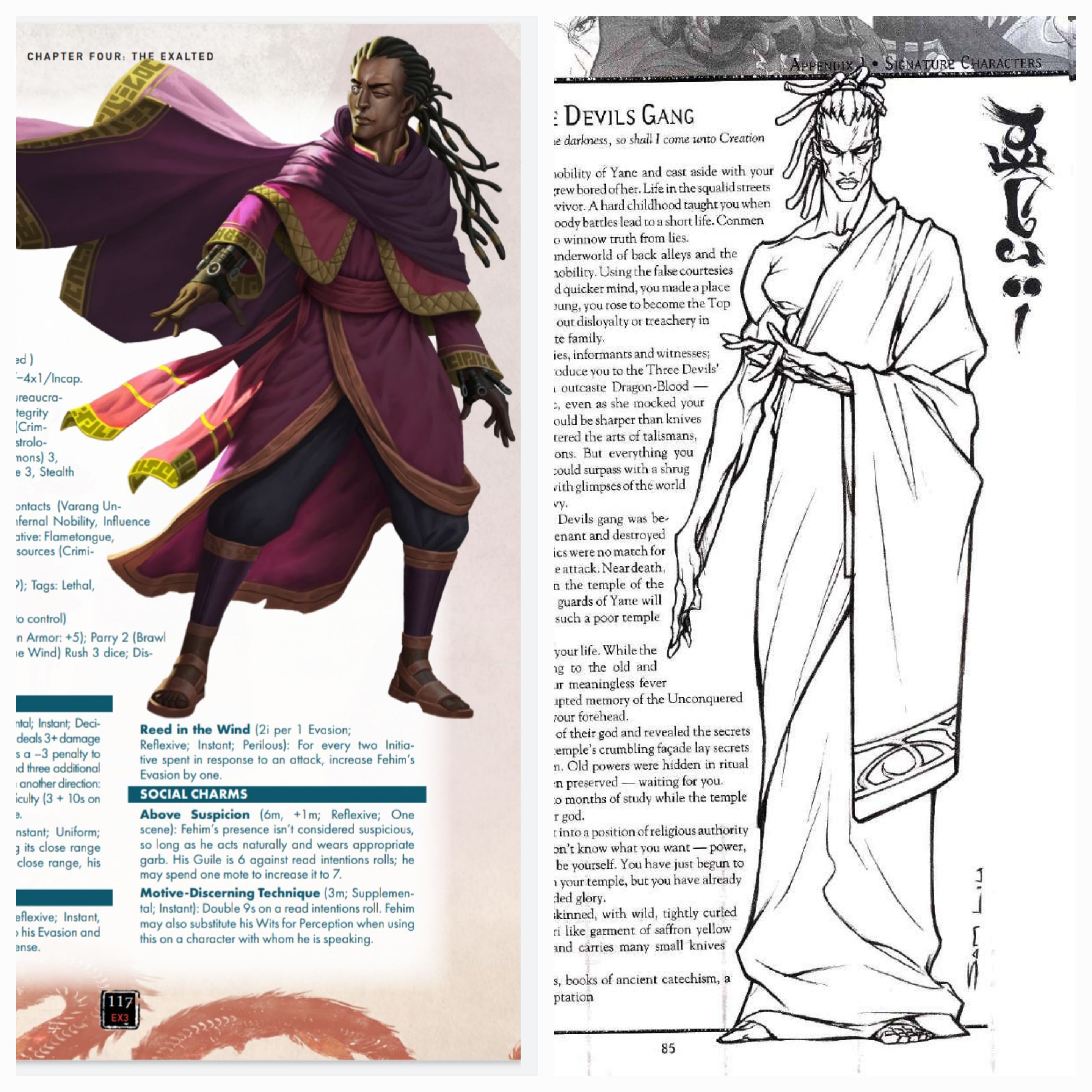 >>97172032This post is a real headscratcher. You seem to read charm names very literally, for one thing; Fire-And-Stones Strike doesn't set your sword on fire, Graceful Crane Stance doesn't give you the legs of those lanky birds, Hungry Tiger Technique does not make you into Tony the Tiger, etc., but the names convey that your perfect poise is like that of the crane's, that your blow cracks open armor like a raging inferno and/or a boulder being hurled into somebody, that your weapon is going to tear into someone like a starving big cat, etc. Regardless, you are also wholly incorrect regarding your suppositions. For instance, Strawmaiden Janest (in the book immediately following Lunars) has Charms named things like Bloodhound's Borrowed Muzzle, Cat's Borrowed Whisker, Healthy-As-A-Horse Technique, and so on, and Pakpao's Charms constantly reference spiders. Sidereals also have quite a few charms inspired by animals thanks to the Constellations of the Gull, the Peacock, and the Crow (they really love birds). Infernals have charms that invoke cities (albeit a very specific one: the Demon City Malfeas). Abyssals and Infernals have charms that literally set their blows aflame in Abyssal Brawl and Infernal Melee despite the prior existence of the elementally dominant Dragon-blooded (to say nothing of other elemental powers such as Abyssal Archery and Dodge's focus on freezing people and Infernal Archery's lightning blasts and shots that root people to the ground with mercurial vines).In short: the current devs aren't so worried about mild thematic overlap as you are. I think there are valid reasons to dislike Exigents, but its goofy to think that its now totally invalid for an Abyssal to have the ability to puppeteer corpses or an Infernal to have a charm where he draws strength from being in a city just because the Puppeteer Exalt exists or that the Architects are also an extant type of Exalt.
