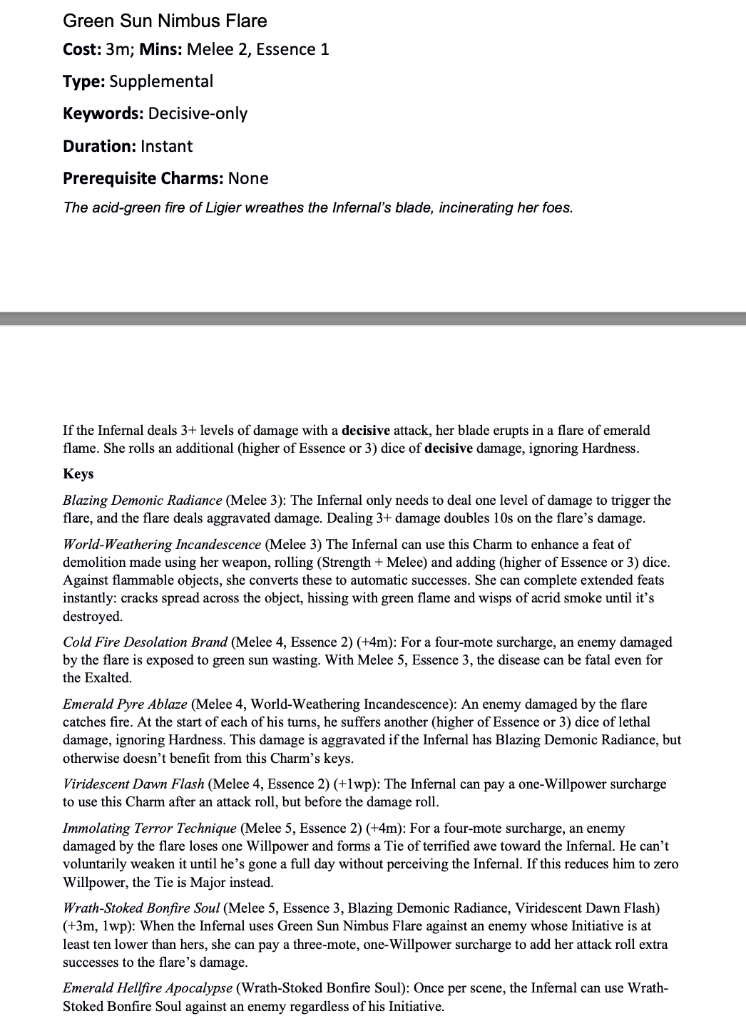 >>97169592>>97169600Yeah, all of that sounds about right. Above all I'd say that I felt like the whoever wrote the Charms had fun writing them and I had fun reading them, and that counts for a lot.>>97170401I think they're about as good as they can get within the Charm framework set by the core. While I plenty of issues with the system, I've still happily run several 3E campaigns, so "as good as it can get for 3E" isn't as faint a praise as it might be taken as.>>97170440>>97170676I rather like both Infernals and Exigents, myself. I think they're pretty different from each other, thematically, conceptially, mechanically, role-wise, lore-wise, pretty much in every way, so not really alternatives or competitors to each other.