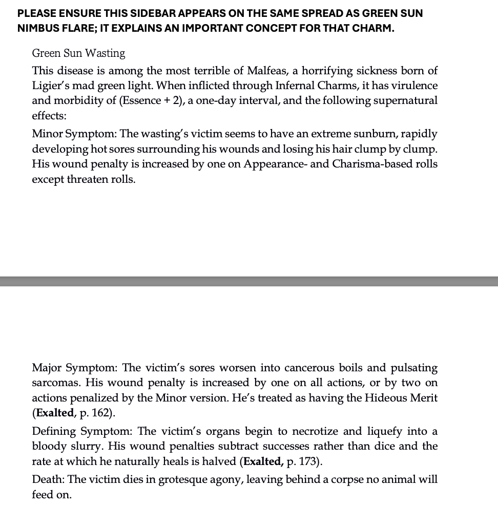 >>97171198>Also here's the Green Sun Wasting description, which is right beneath it.Seems to have less bad effects than Drunken Moth Sickness with the same virulence (except Drunken Moth Sickness is way harder to treat because medical treatment doesn't work unless some kind of magical effect lets it), and the effects are way less bad than Jigsaw Organ Condition even if at E4 it outscales the virulence. Definitely scarier than the mundane diseases at higher essence ratings, though. That's something.Supernatural diseases are so much worse than they were in 1e/2e it's kind of funny. Without the 'your resistance pool drops to 0' effect any old fucker with a favored ability can deal with it.
