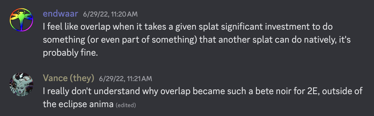>>97171522For me it's less that they compete with each other directly but more that both of them are "late" additions to the game so I compare them and how they added to the setting that way. I think Infernals actually did damage to the setting and the perception of the game, but I don't want to start a dumb argument on something that's just my feelings so just take that as it is. On the other hand I feel like Exigents fill in the niche of god-blooded much better than god-blooded themselves. They take this part of the setting and pump it up to another level that's more interesting for people to play in and also more interesting to interact with.
