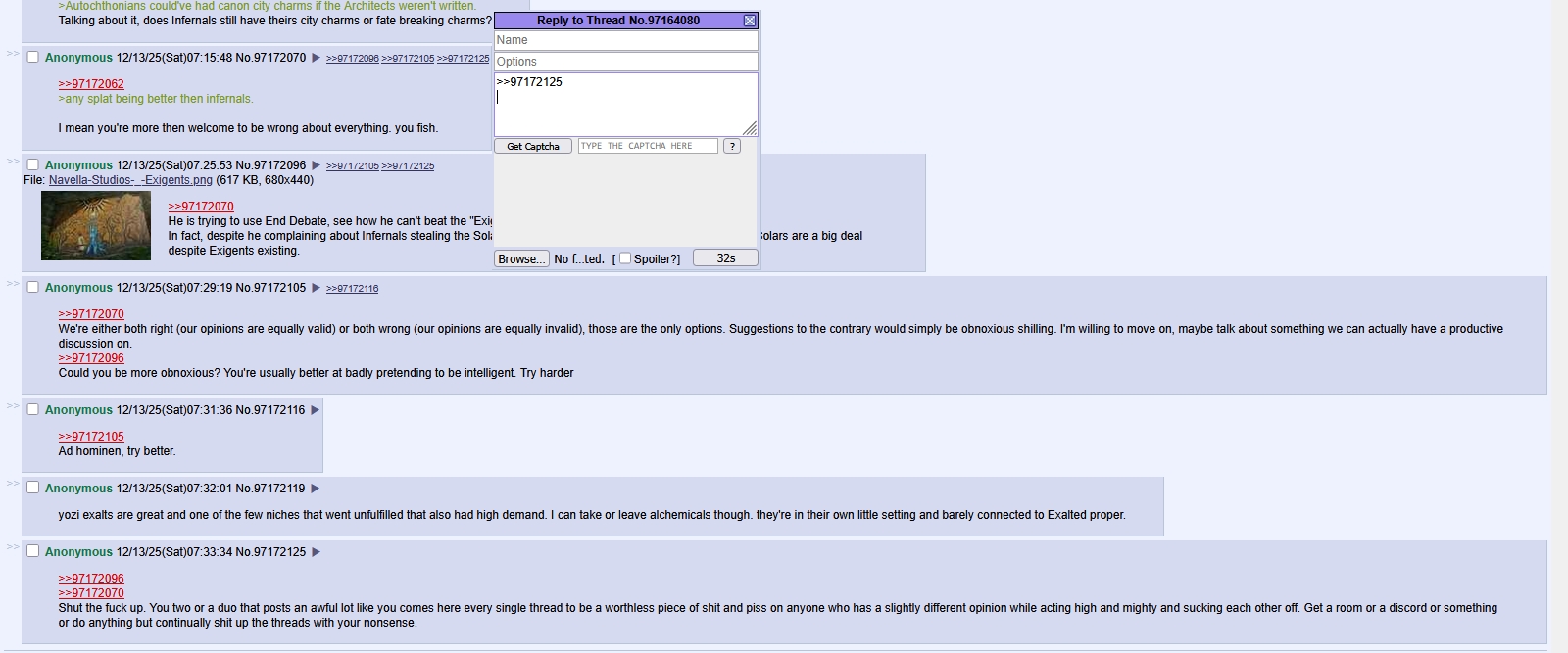 >>97172156The one who was doing reddit gatekeeping was the exigentfag, he even began name calling.
