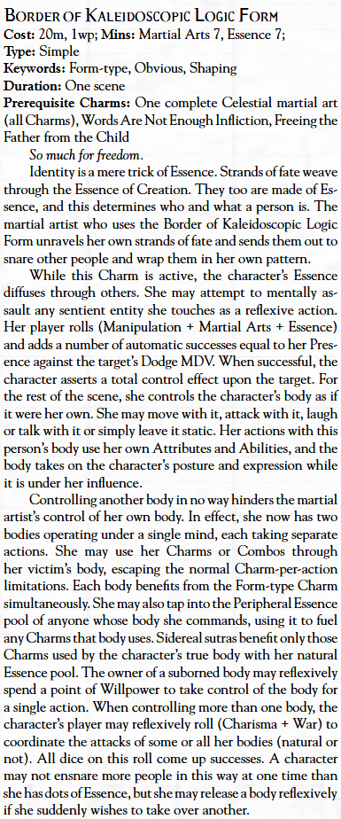 >>97199820>mote tappingI'm pretty much at the top of the attrition game. With my scenelongs (and permanents and indefinites) I only need to spend resources to deal with attacks that use a good deal more resources I need to use to deal with them. That's before cheesing picrel into functionally unlimited resources by dropping underlings out of my hivemind when their resources are spent and tagging new ones in.>asspull artifacts or high powered backup.I'm defending a Directional Titan with my personal first age legion aboard in the Wyld while Creation is getting fucked six ways to sunday by all the possible drawbacks that could be reaming its ass. They can't afford to send comparable firepower what with being tied down elsewhere and battlecruisers or the like would just get shot down. Even if ship-to-ship engagement were a possibility they have nothing to gain by mere destruction, their main objective would be recovery of the DT with minimal damage so it can be put to use in putting down all the other fires. What they would be sending under these circumstances, if anything, is a small but elite boarding party.Like, sure, I could have them pull some artifact that perfectly resolves everything in their favor out of their ass but then what's the point of reading all these rulebooks? I've just gone through reading every single 2e DB charm, including the errata which almost every charm in the DB book has. I still need to read through a ton of martial arts styles and artifacts. I'm in too deep to take a cheap way out.