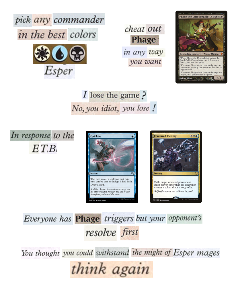 >>97198879>This community has such a massive problem with actually learning the core fundamentals of Magic.Used to be that you started with 60-card and graduated to EDH. Now you have clowns starting with EDH and never learning the value of interaction.