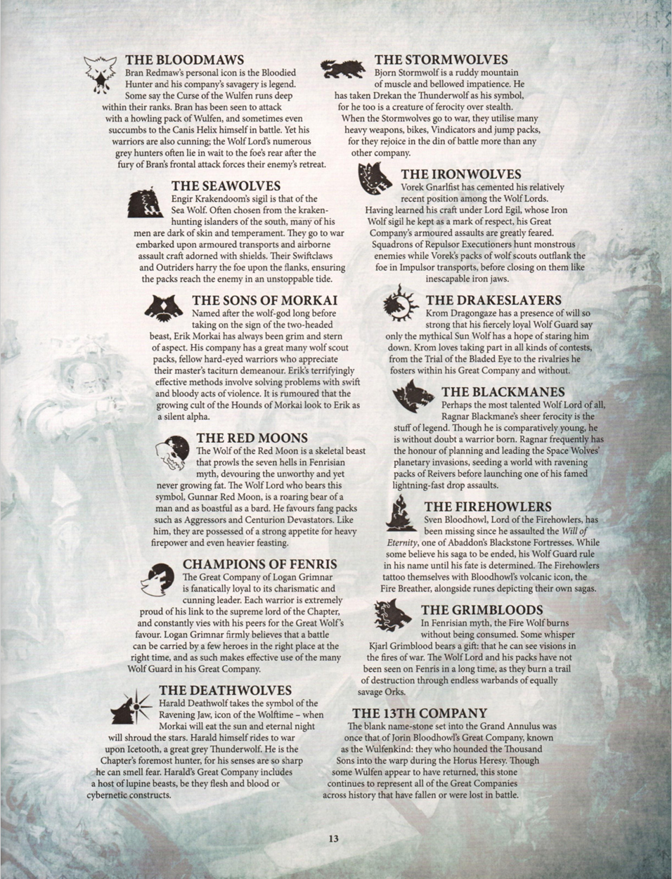 >>97211915The old lore is that fenris is somehow special and humans who live on it are special but somehow you can't transplant that specialness elsewhere plus furfaggotry. So since space wolf companies were 200-500 guys each and there were 13 of them, they served as pseudo-chapters instead of normal companies to make up for the "lol no successors" meme. Primaris lore kind of removed all the dumb shit about the canis helix and furfaggotry in favor of "now you can make other variant chapters".