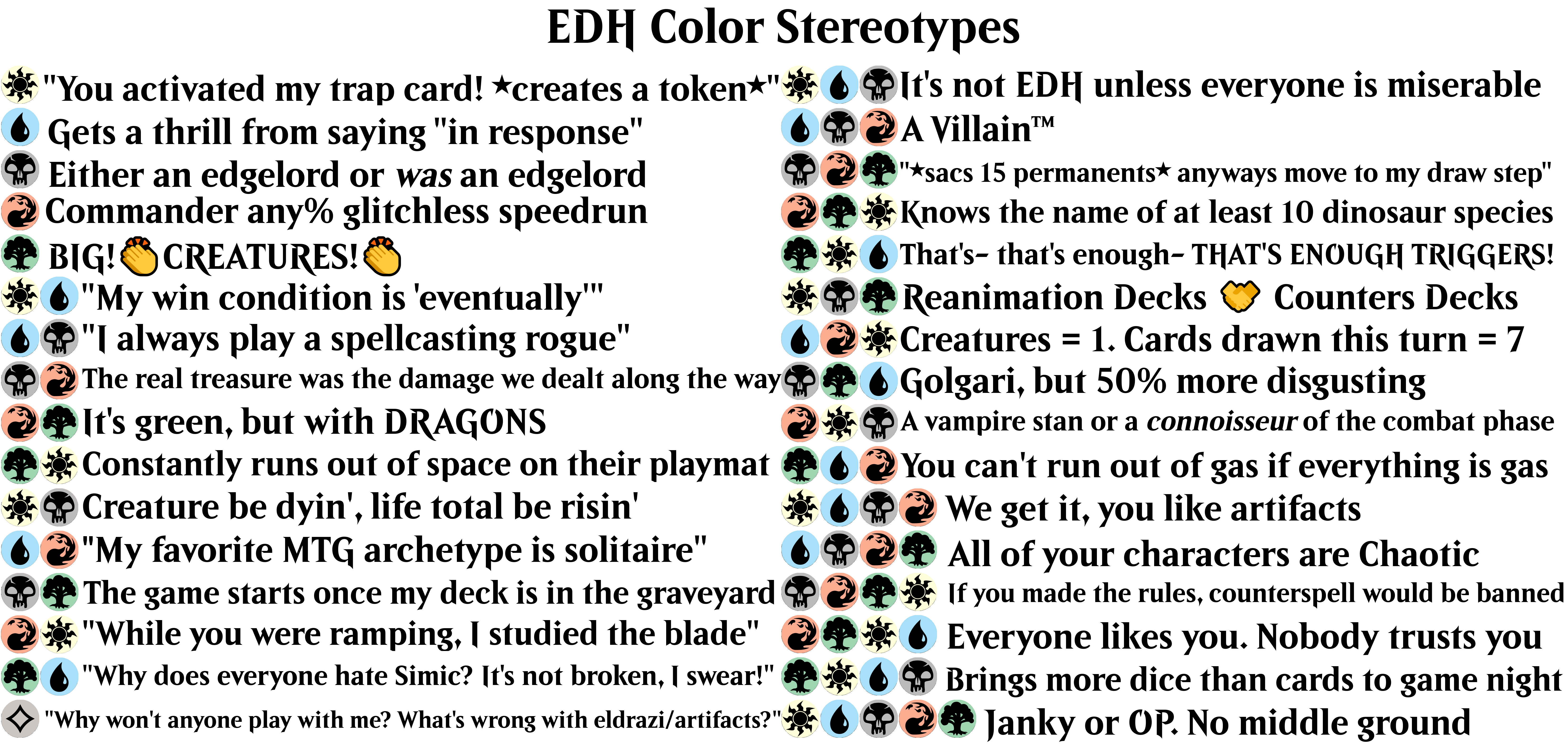 Previous: >>97211098Wishes Granted Edition>Most recent bracket system updatehttps://magic.wizards.com/en/news/announcements/commander-brackets-beta-update-october-21-2025>Outline article introducing the bracket systemhttps://magic.wizards.com/en/news/announcements/introducing-commander-brackets-beta>Current banlisthttps://magic.wizards.com/en/banned-restricted-list#commander-banned>Former Commander website, where you can learn the basics, and read the format philosophy laid down by the rules committeehttps://mtgcommander.net>Statistically see what everyone else puts in their commander decks based on what is posted to the internethttps://www.edhrec.com>Learn about PDH, Commander's budget pauper formathttps://pdhhomebase.com/https://www.pdhrec.com/>Deck list site: You can search for decks that other people have made. Authors often have comments that explain their deck strategy and card choiceshttps://www.archidekt.comhttps://www.moxfield.comhttps://www.tappedout.net>Find out what lands you can add to your deck, sorted by category, based on a chosen color identityhttps://managathering.com>Card searchhttps://scryfall.com>Proxy a deck or a cube for cheaphttps://pastebin.com/9Xj1xLdM>Preconshttps://magicprecons.com>TQRakdos faeries 2026?