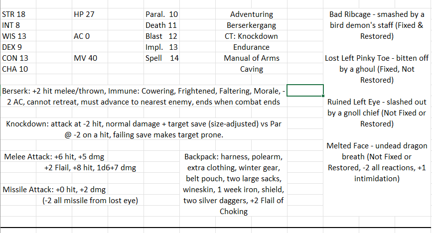 >>97226974>just a google spreadsheetits excel actually, and ive been playing him for almost a year now.also>just a spreadsheetare character sheets less valid because theyre formatted in a speadsheet and not a pdf? Seriously tho, youre attacking shadows. I like acks, and play it regularly. This was his stalwart henchmen, max daamge. he was a normal man I got up to level 2, but he was killed, and left us after getting ressurected, because he came back wrong, with "bird parts" filling in the parts that were damaged, making him look like a mangy avian furry. he left on good terms and I might be able to hire him again.