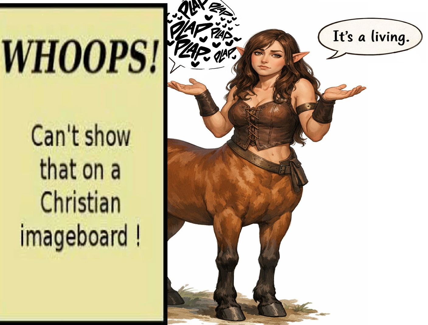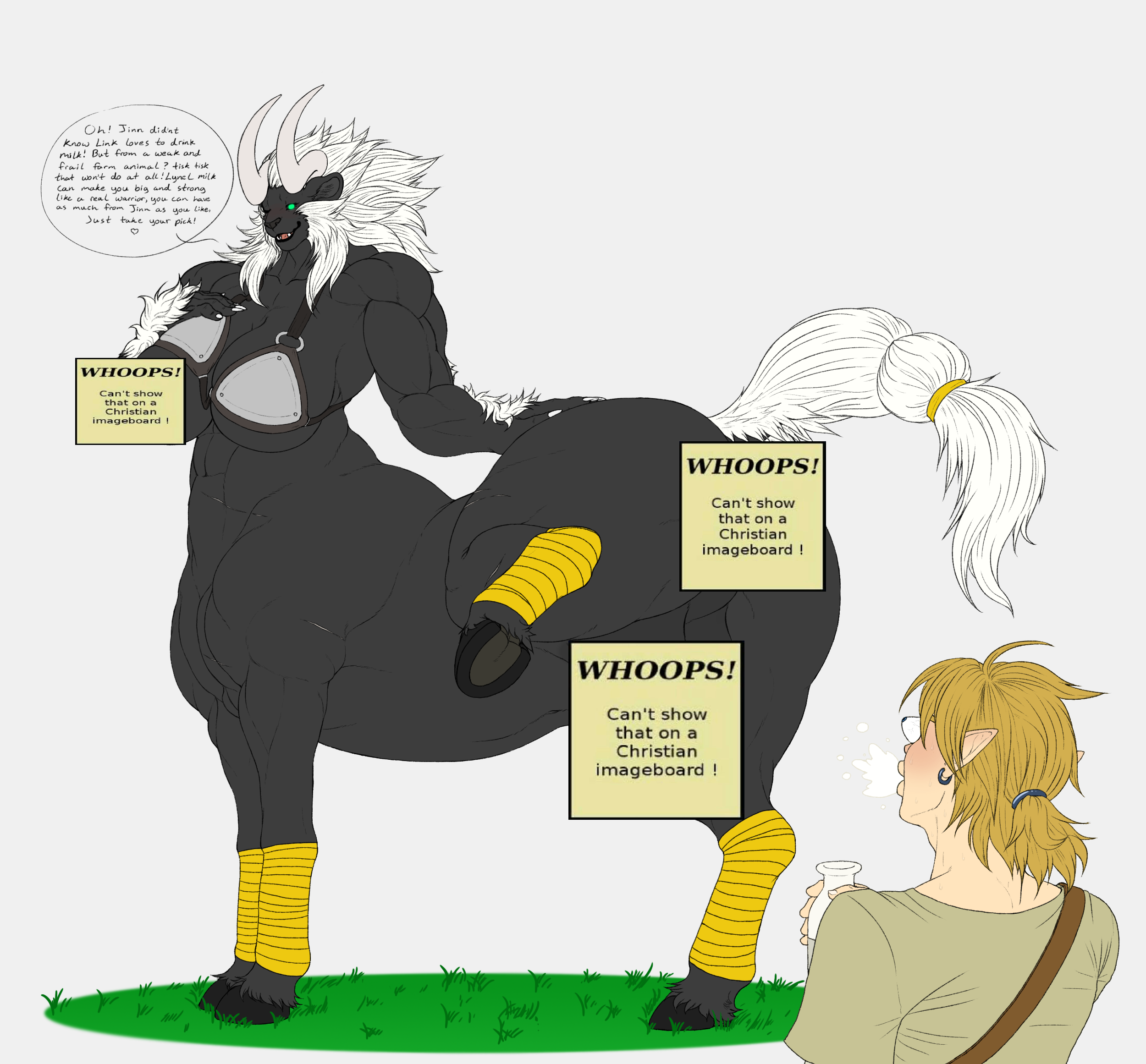 Do the centaurs in your world get two sets of boobs? What if a centaur had a flat human chest, but large engorged crotchtits?Do they get a crotchbra?