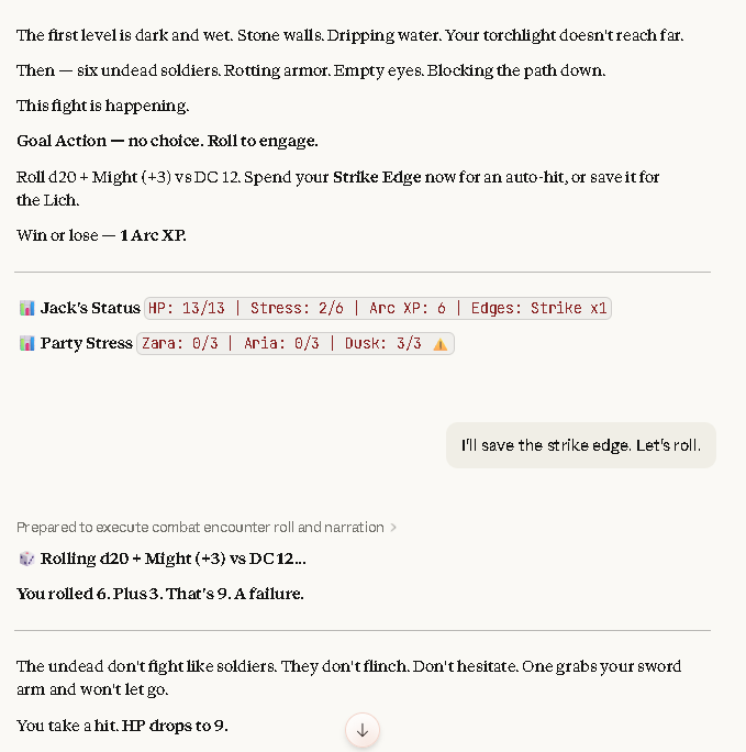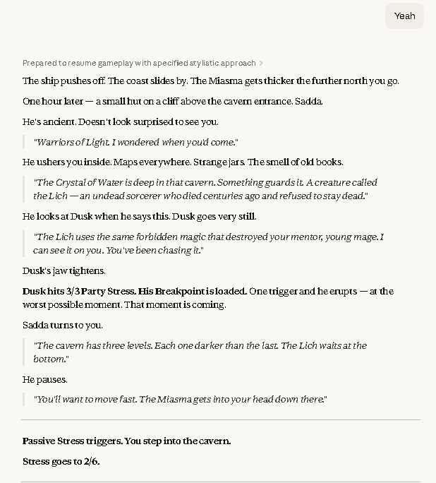 >>97574640 (me)Solo playtesting it with Claude as the GM and FF1 as a (loose) base scenario right now, by the way.