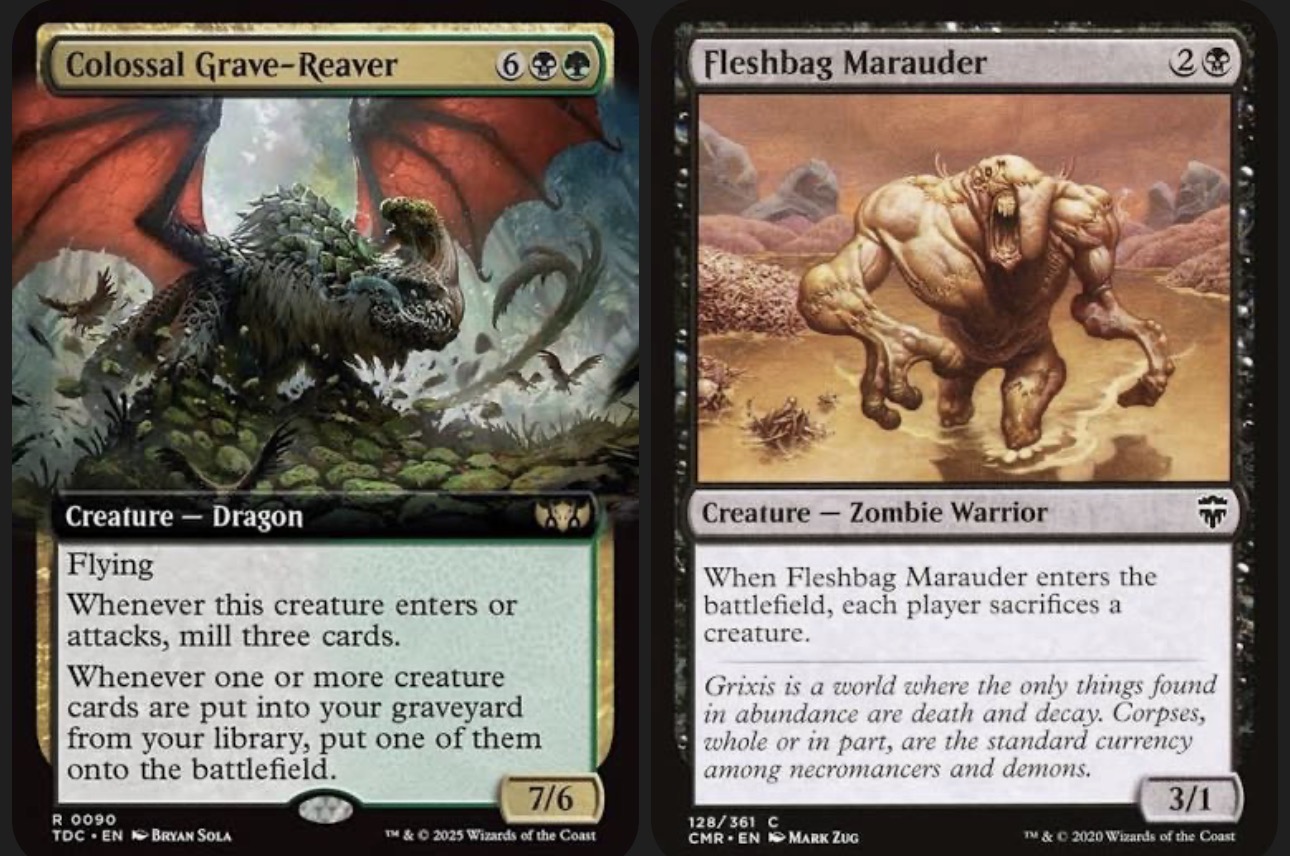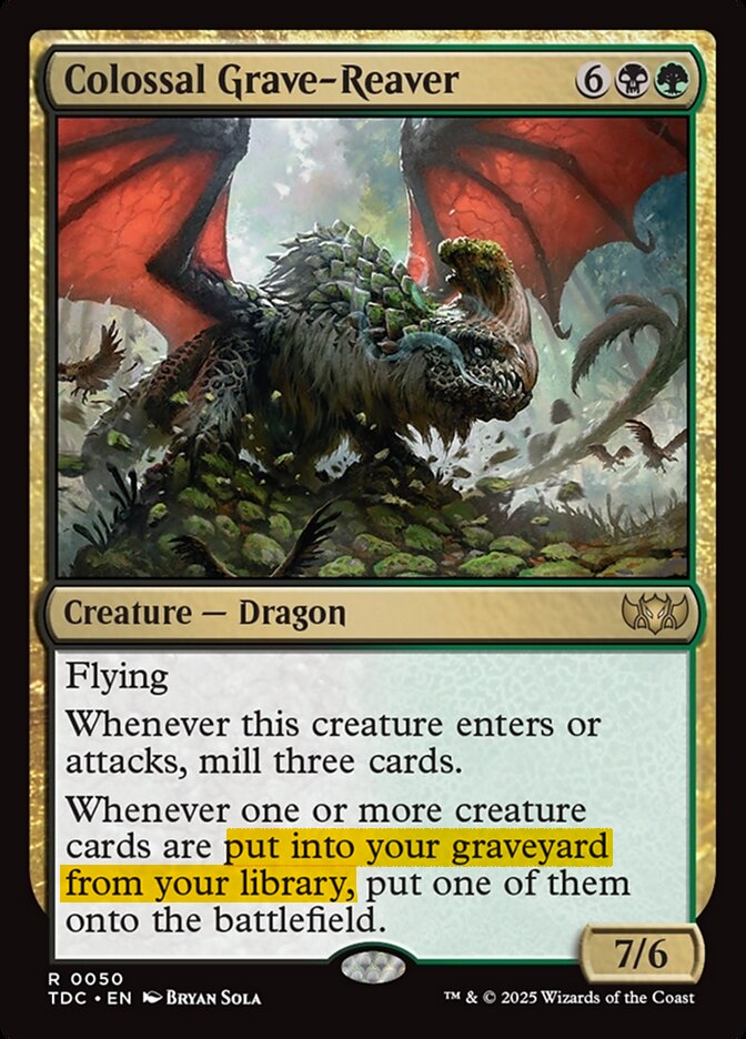 >>97296973How do you figure that, anon? What does the 3rd block of text on Colossal Grave Reaper say? The line beginning “Whenever one or more creatures…”