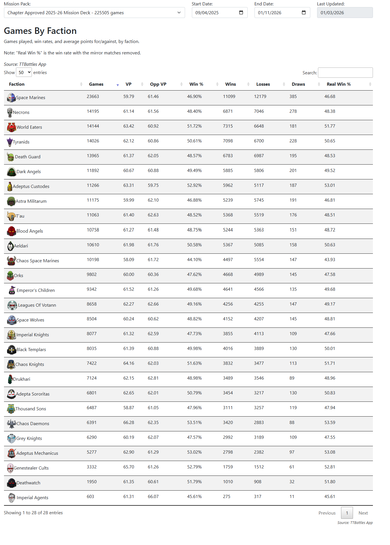 >>97297807The tabletop battles app is not just used for tournament play. People use it casually too as a score tracker. The tournament play rates are much, much lower for all factions. This includes a fair amount of casual play as well.