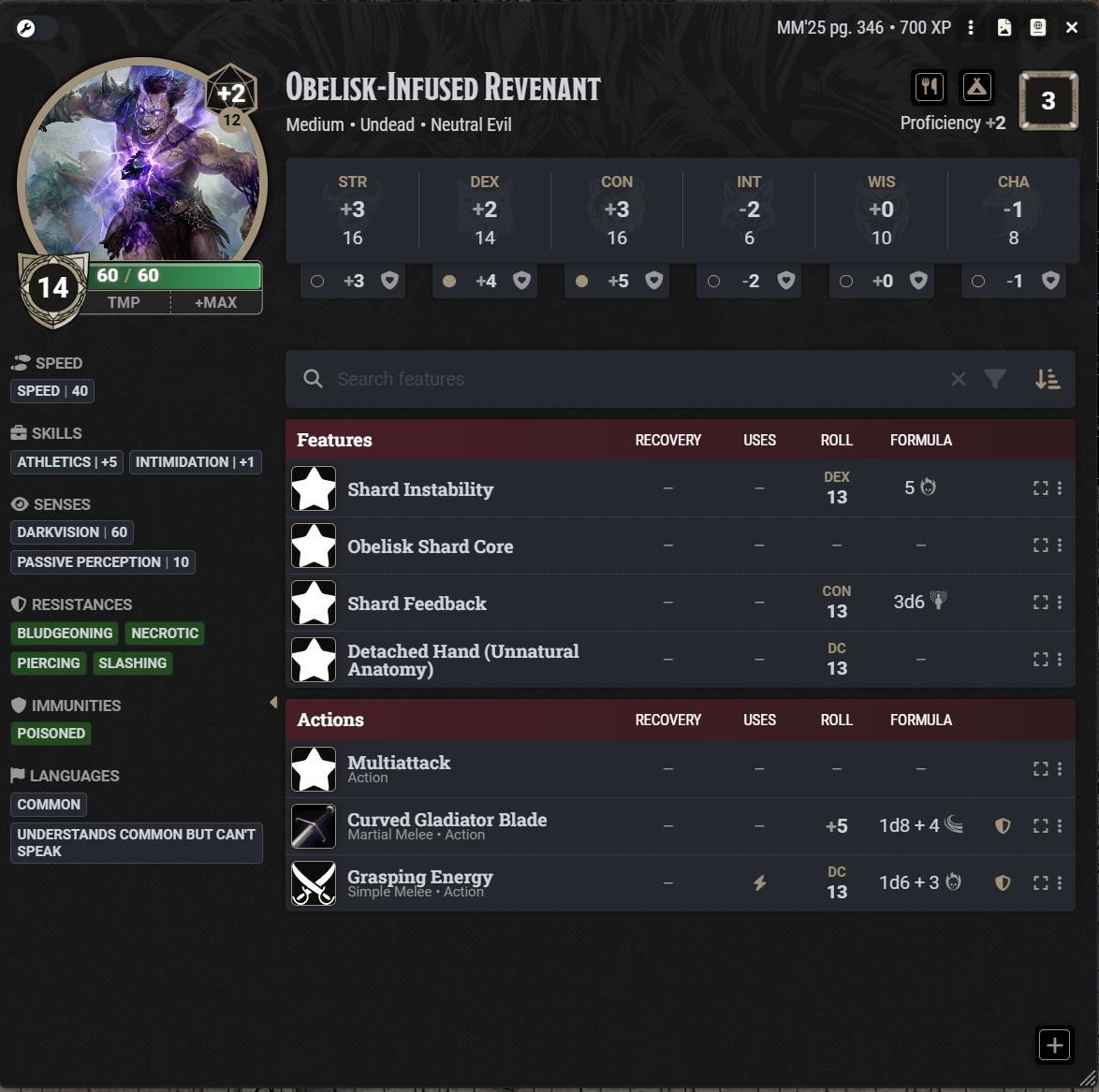 Inspired by some cool art, I have made the most over-designed CR 3 monster.>charges at you, possibly knocking you prone>possibly grapples you on attack>can grapple an additional creature>a recharge ability to possibly restrain you for one round>starts randomly causing minor effects when below half heath>explodes on deathbut you can>destroy or disrupt the floating hand to remove its grapple ability>destroy or disrupt the shard to hurt it and remove its damage resistancesI am going to pair this in an encounter with a CR 3 Red Wizard of Thay and a few skeletons.