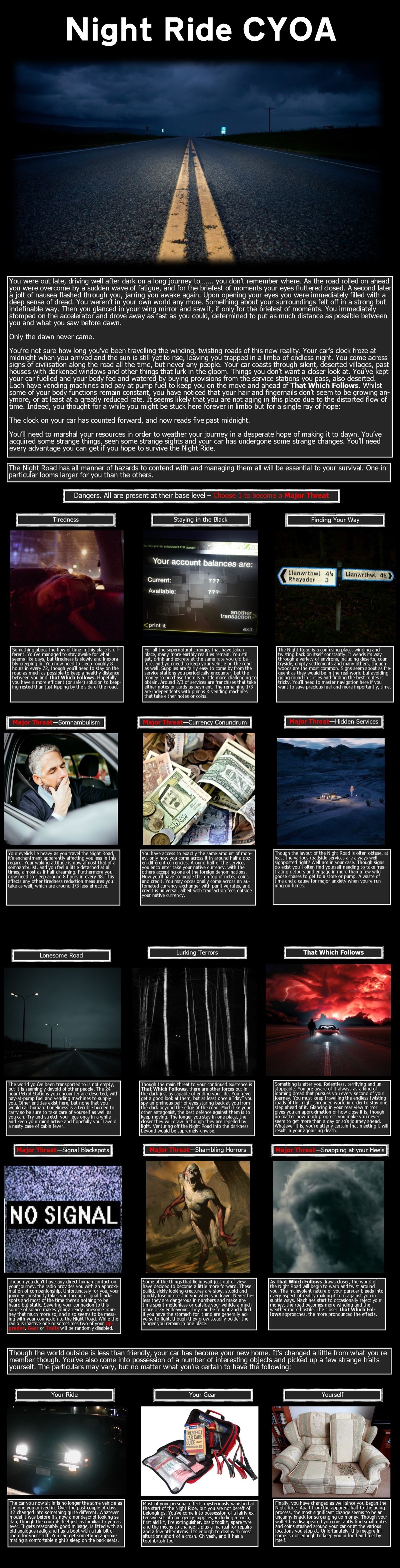 >>97303951>Give me a hard cyoa that's not edgy, six pages or less.Night Ride is horror, but doesn't rely on atrocious acts or gross monsters to scare the player, only the lethal stakes of finishing an arduous act.