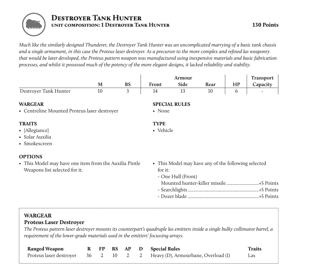 >>97321821>>97321425those arent even slightly impressive stats.Rapier laser BS4 FP2 S10 AP2 Dmg2 HeavyD Armourbane 65 pointsTardlaser BS3 same exact damage stats but Overload 1-in-6 chance it just blows itself up. And because BS3 if anyone ever slaps it with suppress it's trash that hits on 6+ not 5+ and it loses all use instantly. Costs exact 130 points like two rapiers that inflict 2.7x more damage and zero self-damage. It's not hard to kill, 13 side 10 rear and 6 HP breakpoint so 1 single lucky melta hit one-shots it.If it has to move, it's putting out an average around 1 wound per turn onto av14 and never inflicts statuses. If it gets shot in the side it goes down instantly unlike an actual good tank like kratos which does 10x more effective damage while being 10x tankier and BS4.Tankiness in 3rd is about being 14/14/14 so you're immune to flankers and deepstrikers and melee units entirely, and big enough HP pool it's not worth even attempting to focus fire your unit down or try to get lucky (non-armorbane weapons won't scratch kratos at all, and armorbane weapons do literally nothing to reduce kratos effectiveness if they only knock half his HP down while being unable to inflict statuses, only to have a techpriest walk up to kratos and heal it back up), and being such a powerful shooter that it's worth burning 1 reaction each turn to Smokescreen (not a BS3 piece of shit with 2 total ineffective dmg2 shots)And offensively it's a complete joke, it doesn't scratch big tanks, it can't status them, it can't hurt troops, it can't hurt terminators. It's a one-trick pony that does that trick very poorly. It'd already be just 'okay' if it was 130 points with overload1 bs4 or bs3 with no overload. Having both 1/3rd the shooting of laser rapiers while also teamkilling itself constantly makes it a joke.