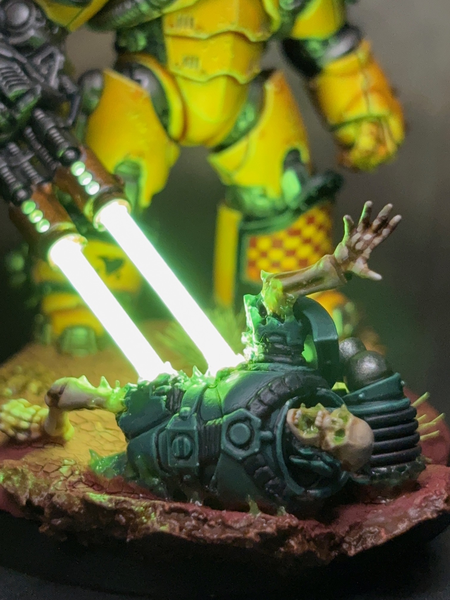 >>97317130My opponent is really getting the hand on positioning. He usually plays pretty conservatively, holding back in the early game and avoiding pushing his reactors too hard, which isn't what you'd expect from warhounds but it means he's got a lot of his firepower in just the right place and the titans are running cool enough to play with shieldbane and maximal fire.The Twin there would kill itself with its own reactor overload turn 4 and cause a magazine detonation, which killed on the of warhounds it had been fighting as well. Rock 'em Sock 'em Reaver would also detonate a warhound's magazine which did quite a bit of damage to surrounding Audax titans, but not enough. I need to look up in the FAQ if magazine detonations bypass void shields or not.Really good game. Pretty quick too. And now I get to go to a museum presentation on reindeer.