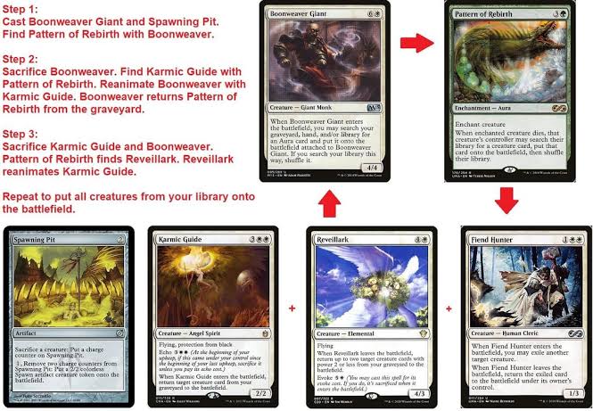 >>97317509>Seems like any manaless sac outlet does this.This is true, but spawning pit is cheap as dirt compared to Ashnods/phyrexian altar. Also if you're using those, you can just get infinite mana with gift of immortality.The nice thing about Boonweaver / Pattern of Rebirth though is they both tutor the other. Obviously BW finds PoR. But you can also attach PoR to a mana dork, sac it, grab BW, who searches gy for PoR.