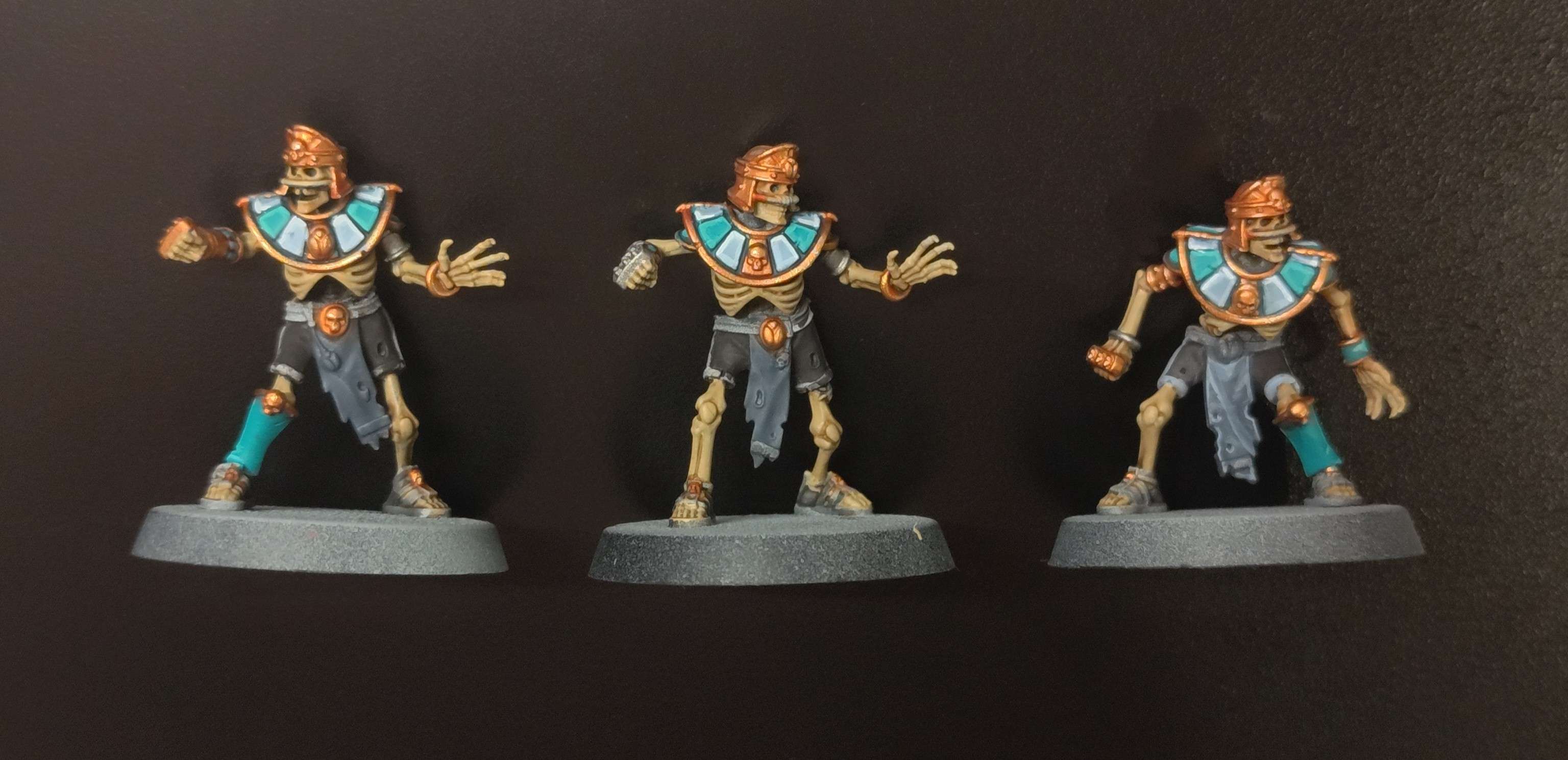 >>97326765The colors look good. Personally I think you could add a little to helmets since right now they look a bit boring. Maybe the highlights will solve that, but I think putting the blue colors on the top fringe part of the helmet would look nice. Maybe a paint the scarab on the middle guy like a jewel of some sort.