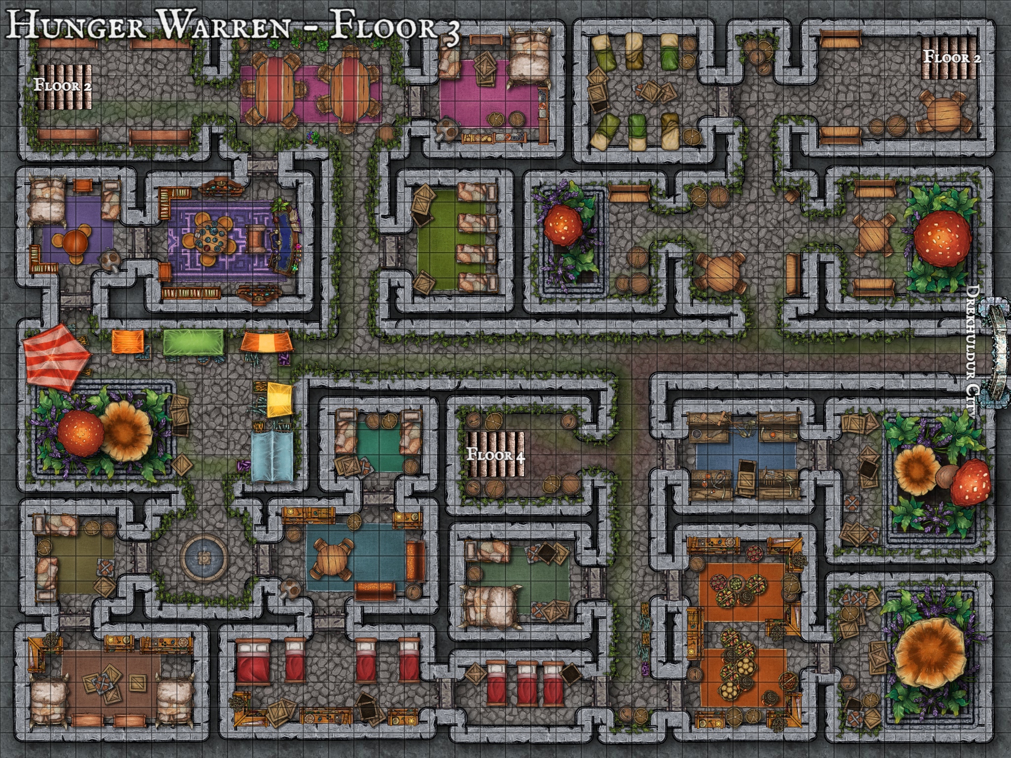 >>97330815Just for fun, anon. Lots of GMs only GM because we enjoy getting to share our worlds.>>97330589>>97330594Thanks! Threads are as good as we make them. Here's a level of the dungeon itself. We play on TTS, so I make maps for everything. And because there's a city comission in charge of sealing off these dungeons, the players can pick up a map of them that's accurate to the degree that was known when last explored before locking the dungeon (known as a Warren) down. This one got a wasting disease introduced into the residential district.